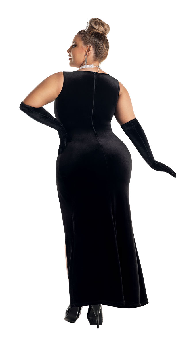 Revamp your look in this plus size Tiffany Honey costume featuring a long, black bodycon dress with a built-in teddy, thick shoulder straps, a back zipper closure, a high leg slit, long black gloves, a glamorous necklace, clip on earrings, a mini tiara, oversized sunglasses, and a cigarette holder.