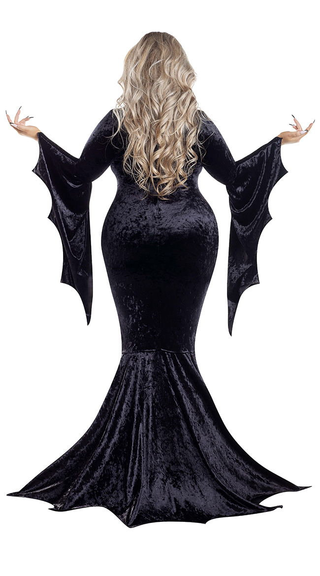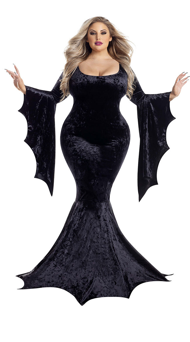 Draw your prey in with this plus size black velvet dress featuring a scoop neckline, long draping bell sleeves with a bat shaped trim, a form-fitting bodice, and a flared skirt with a jagged hem.