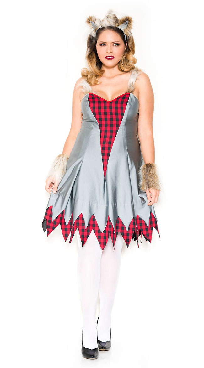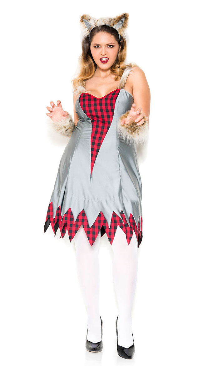 That neon moon is just as dangerous as you, vicious babe! Get wildly voracious in this plus size Wicked Werewolf costume featuring a jagged hem dress with a sweetheart neckline, checker print insets, a shiny silver overlay, and an attached faux fur tail, faux fur wrist cuffs, and a wolf ear headband. (Tights not included.)