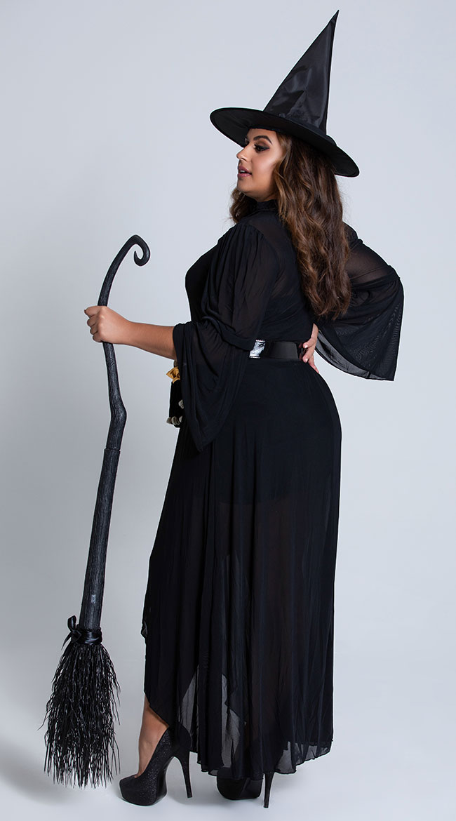 Does black reflect your soul? Embrace your love for darkness in this plus size You Goth It Witch costume featuring a black gown with long mesh sleeves, a black ruffled collar with a red jewel accent and magical pentagram detailing, a solid bodycon underlayer, an adjustable vinyl waist belt with dangling voodoo doll and skull head accents, a sheer mesh skirt with a front opening, and a matching witch hat. (Broom and shoes not included.)