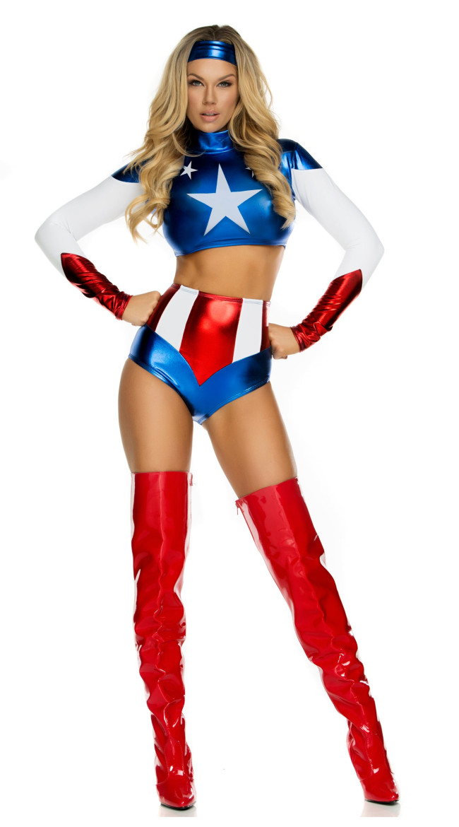 Show off your star-spangled style in the Pretty Patriot Sexy Hero Costume. This bold two-piece set includes a metallic long-sleeve crop top with a striking white star detail, matching high-waisted shorts with red and white paneling, and a coordinating headband. Perfect for channeling your inner comic book heroine, this costume pairs effortlessly with thigh-high red boots for a look that’s equal parts fierce and patriotic. Get ready to save the day in star-studded fashion! Shoes Sold Separately