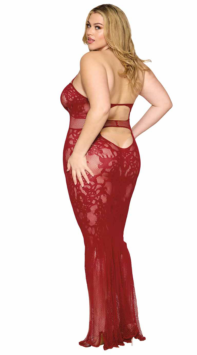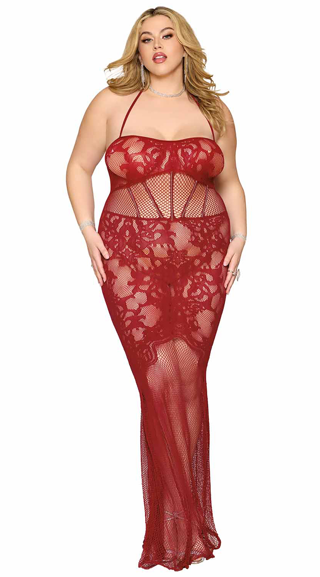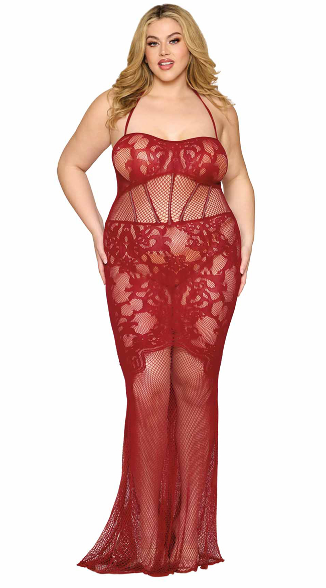 • Seamless bodystocking lace gown with fishnet waist corset inset