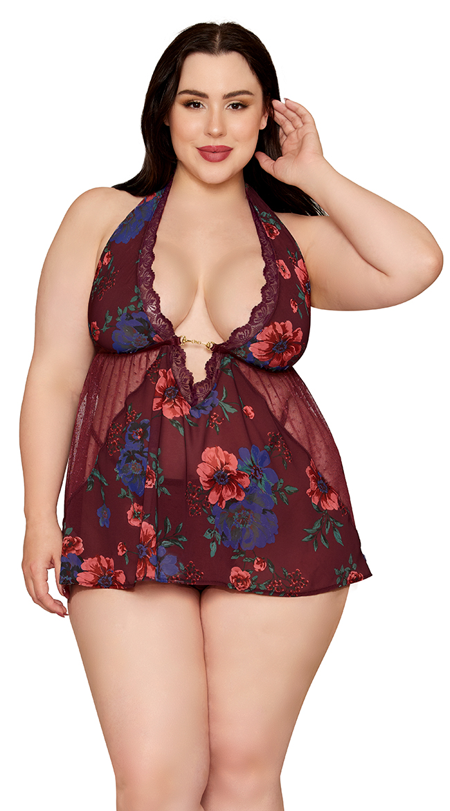 • Printed chiffon and dot mesh babydoll and G-string set with lace trims