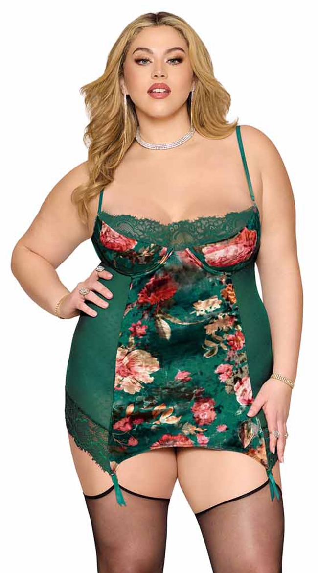 • Printed stretch velvet garter slip with dot mesh and lace trim