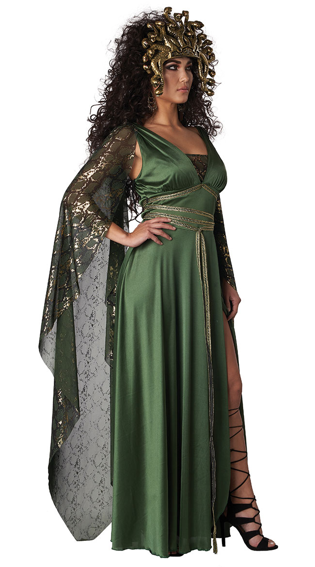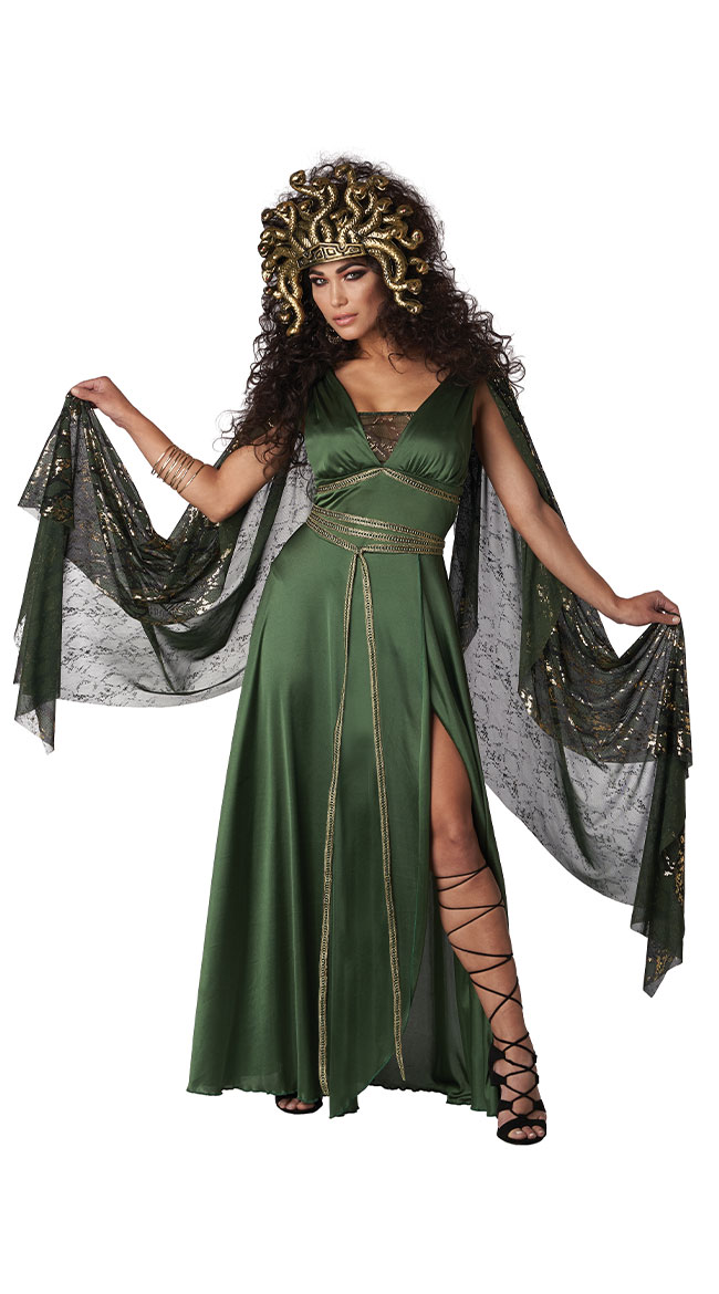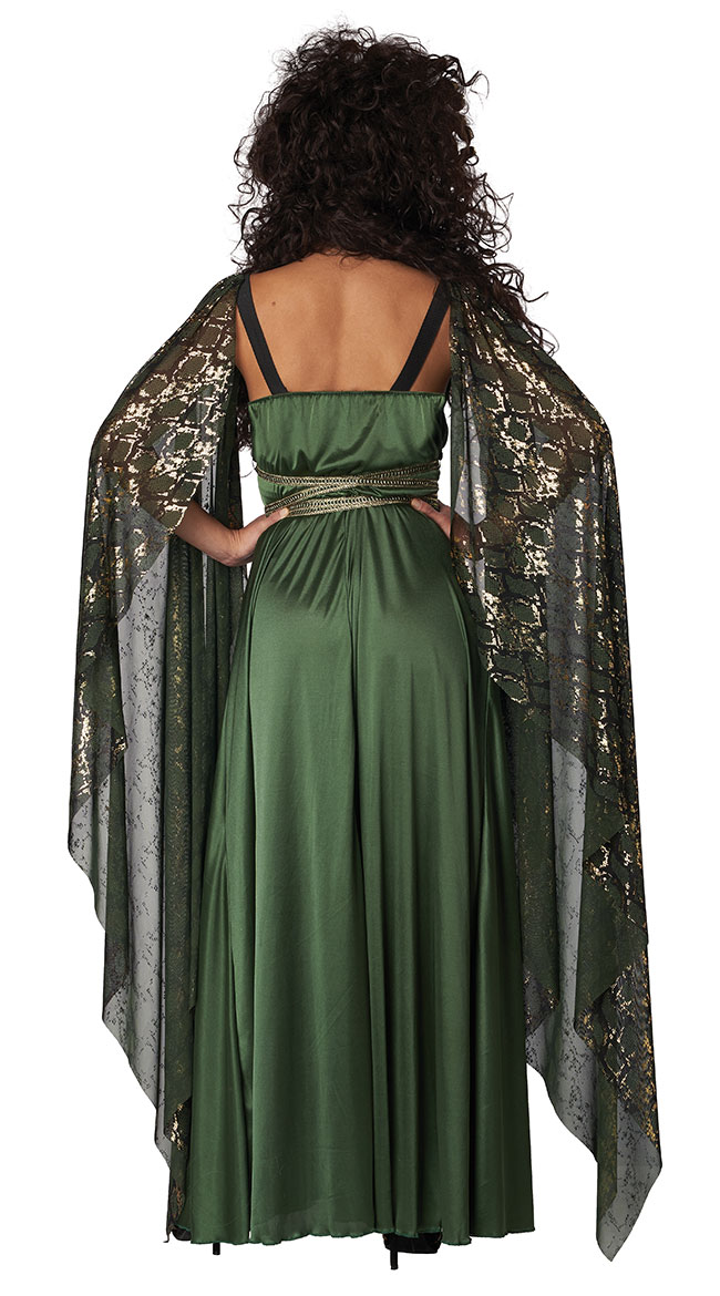 Some say looks can kill! You will mesmerize them in this Queen Of The Gorgons costume featuring a dark green V-neck dress with a high front slit, attached drapes with a snake print design, a sheer mesh tube top, a gold wraparound belt, and a gold snake headpiece. (Jewelry and shoes not included.)