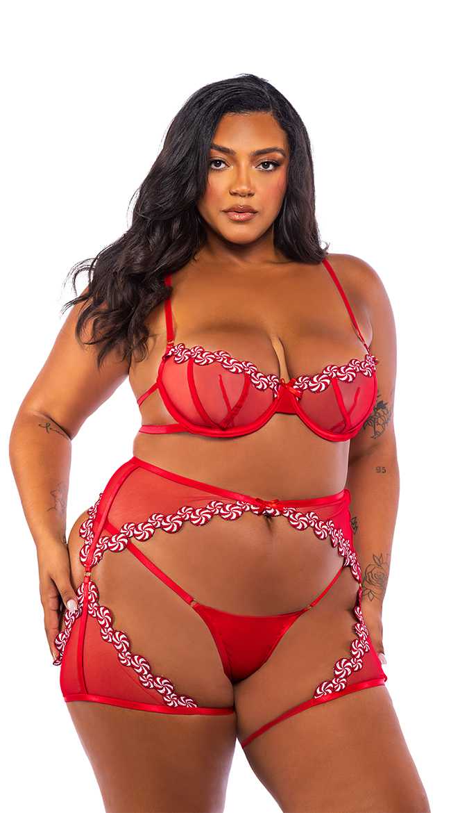 • Bra: Embroidered candy trim with mesh and satin, Balconette cup with underwire, Satin ribbon bow detail, Hook & eye closure