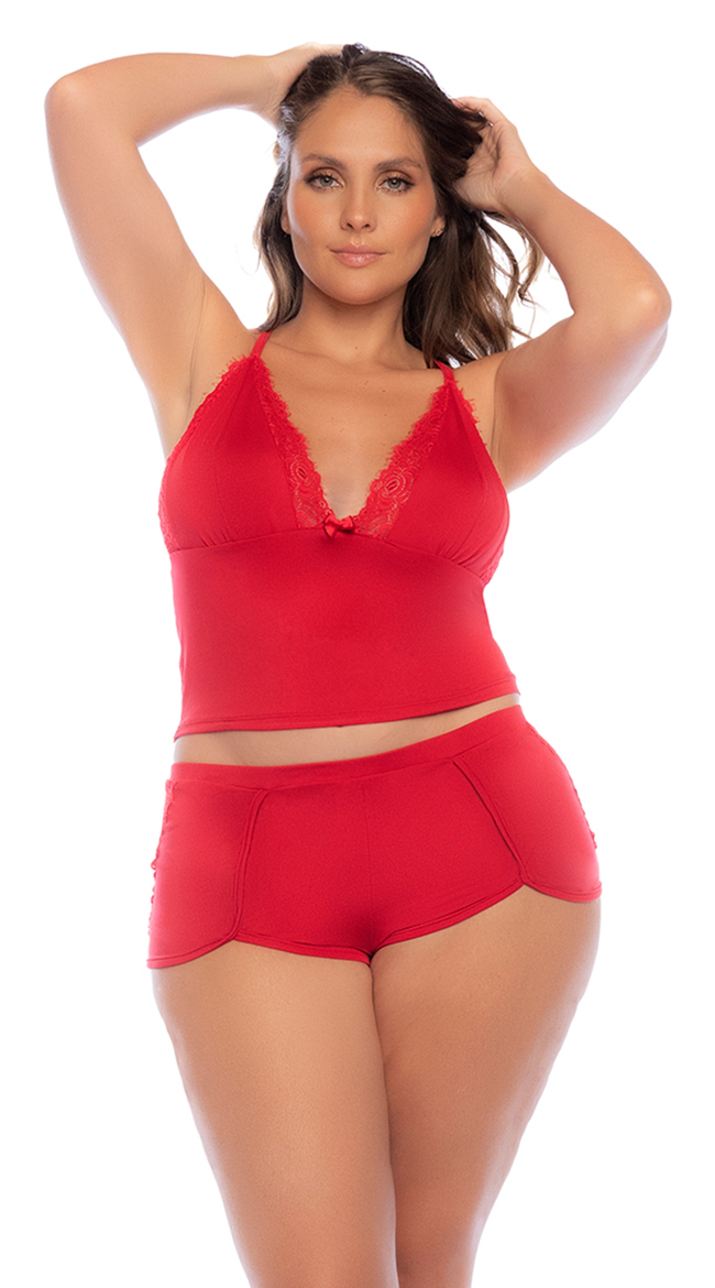 • Get in the spirit with this two-piece set with in a seasonal red with eyelash lace trims
