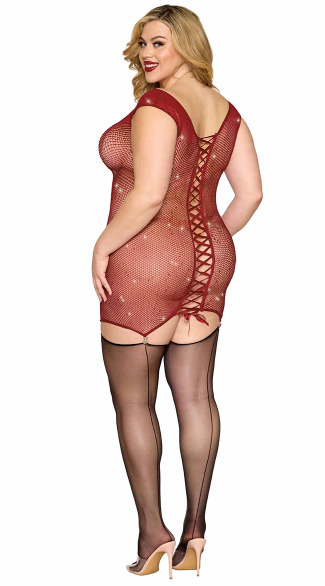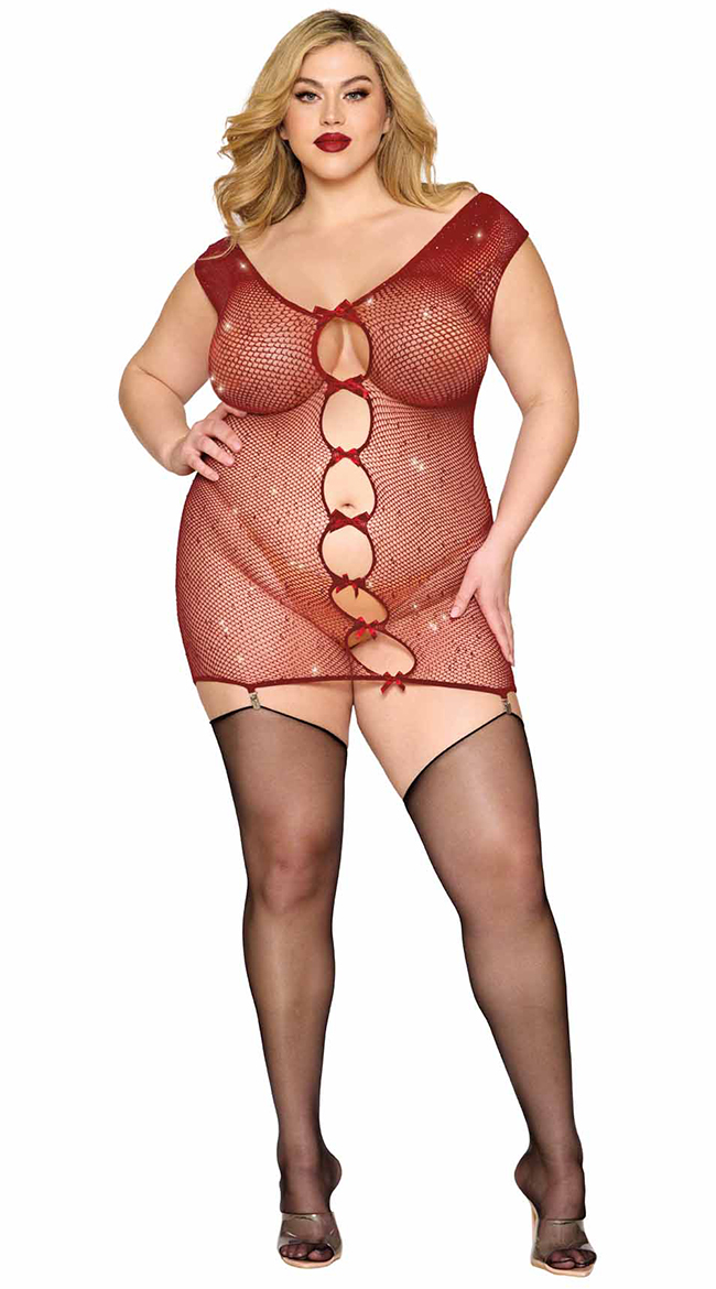 • Seamless garter slip with iridescent red rhinestones, keyhole openings on the front with bows accents,