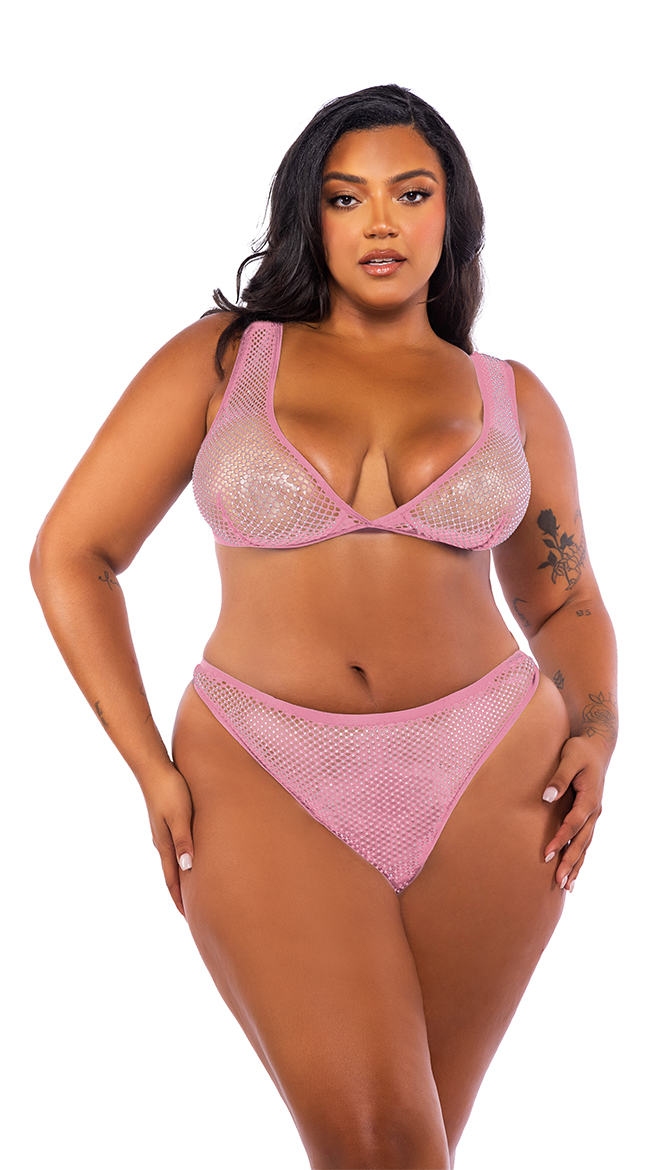 • Bralette: Plunge neckline, Rhinestone fishnet, Fold over elastic trim