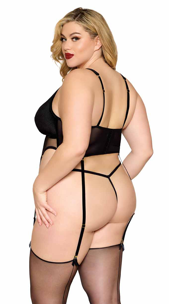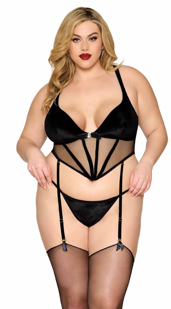 • Bustier: Mesh: 100% Nylon; Velvet: 95% Polyester, 5% Spandex; Foam Cups: 100% Polyester; Power Mesh: 85% Nylon, 15% Spandex; G-String: Velvet: 95% Polyester, 5% Spandex; Exclusive of Decoration
