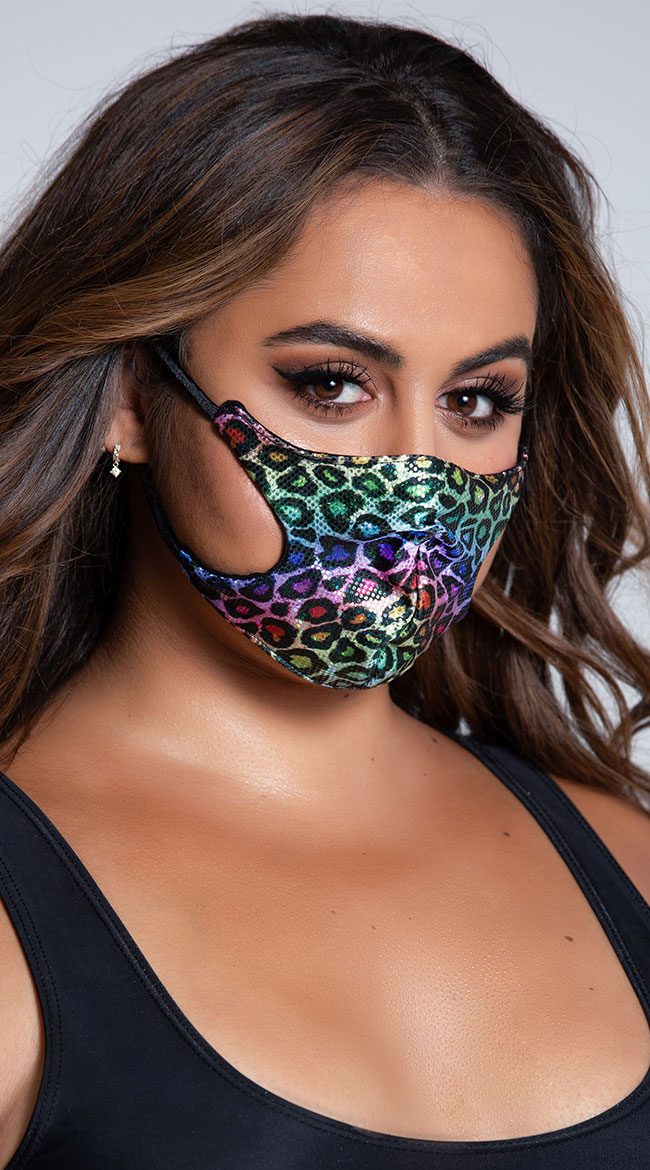 Prove you're a wild one in this stylish face mask featuring an animal print with eye-grabbing rainbow hue, a front seam for easier breathing, sexy side cut-outs, elastic ear loops, and a fully lined interior. (Tank top not included.)