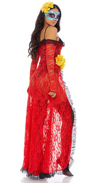 Celebrate the dead in this Reina De Muerte costume featuring a black bodysuit with a sweetheart neckline, adjustable spaghetti straps, a red, lace gown overlay, long sleeves with finger loops, a ruffled black trim, a high front slit, a thong cut back, yellow flower accents, and a floral headband. (Mask and thigh high stockings not included.)