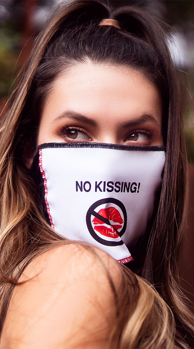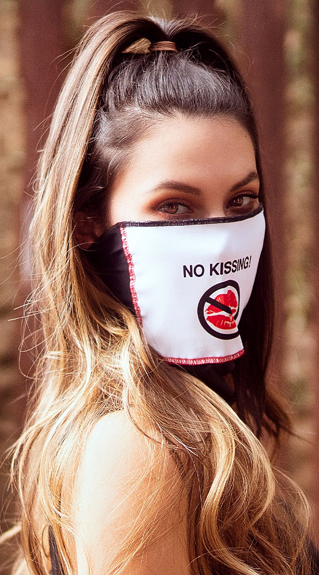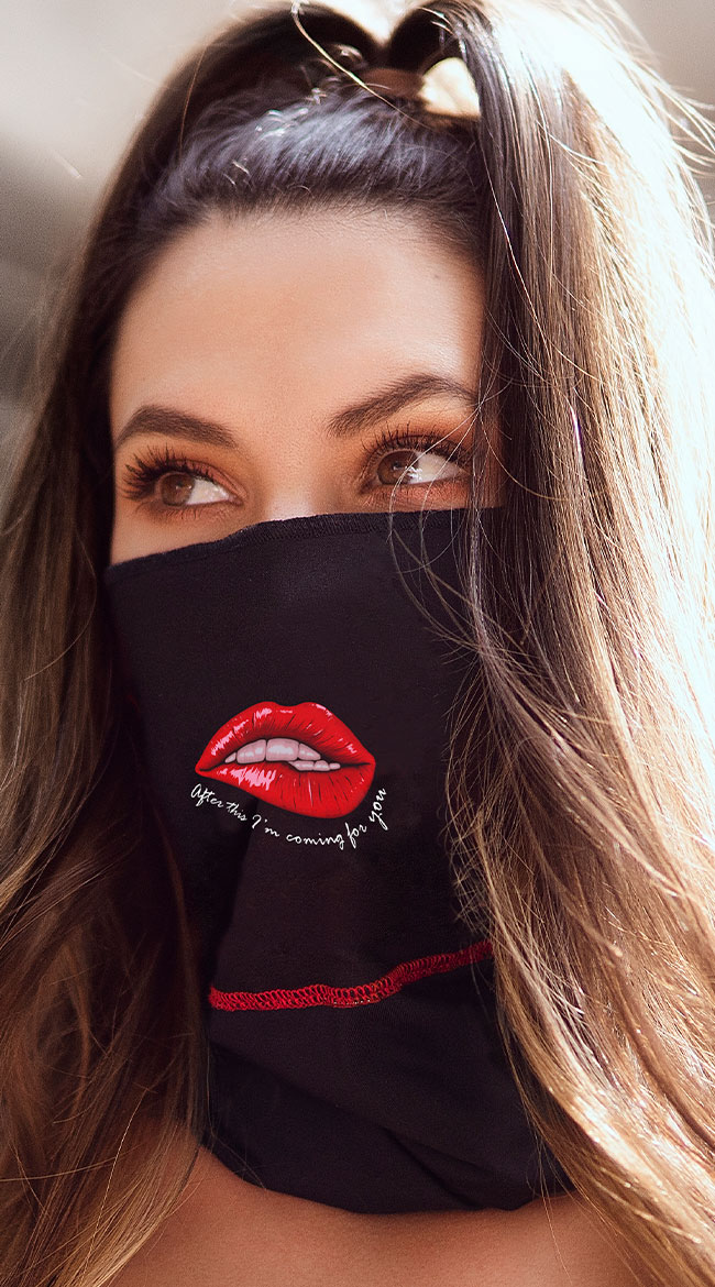 Dare to walk boldly. Give your lover a flirty statement in this stylish reversible bandana mask featuring a solid black base with red contrast stitching, a biting lips print with AFTER THIS I'M COMING FOR YOU printed in script, and a tie back closure. Mask is reversible and shows NO KISSING printed in black with a lips logo on the reverse side.