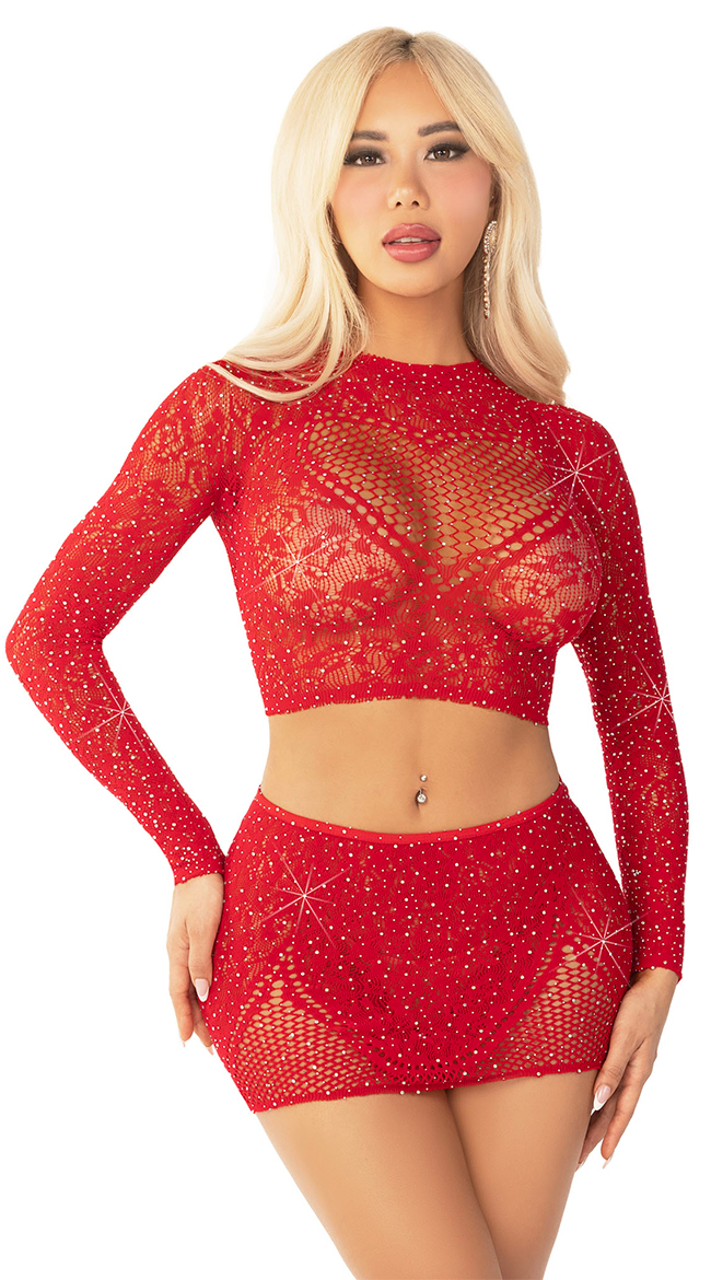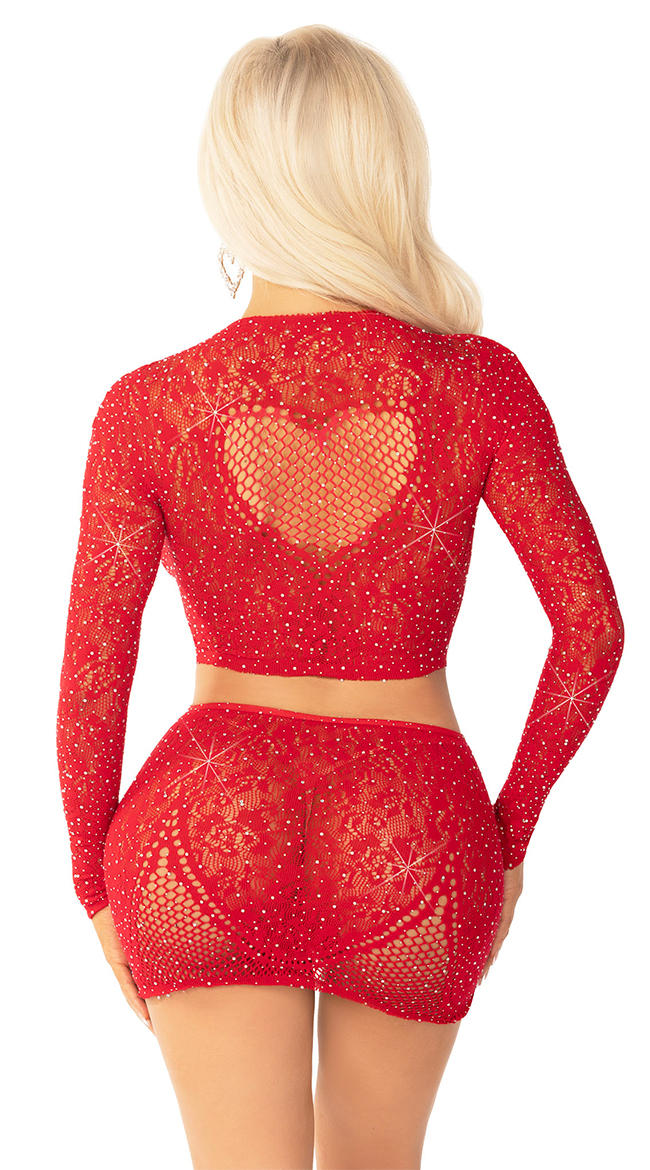 • 2 PC Rhinestone lace and net crop top with heart keyhole detail and mini skirt.