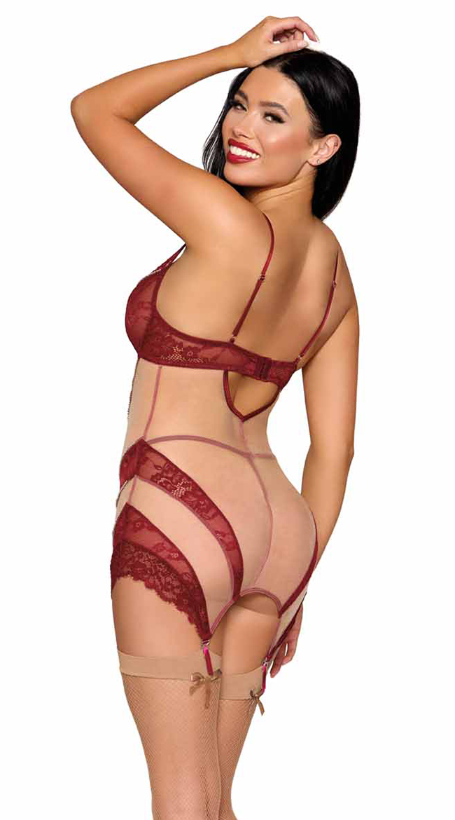 • Stretch lace and ultra sheer nude mesh garter slip and G-string with snag-free rhinestone seaming details