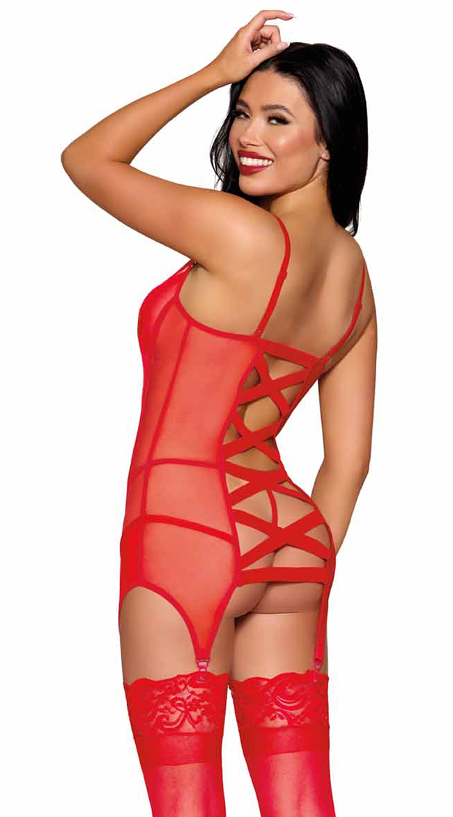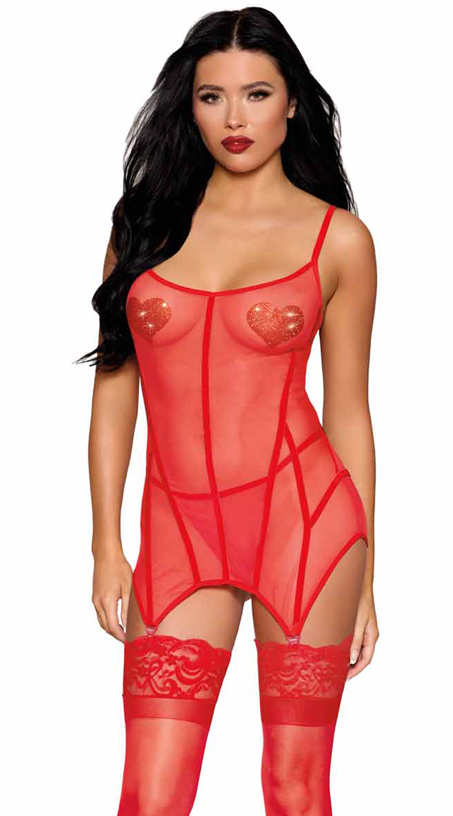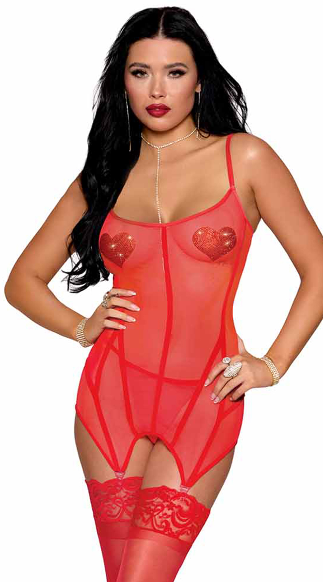 • Garter slip features rhinestone heart details, velvet “lace-up” back and adjustable straps
