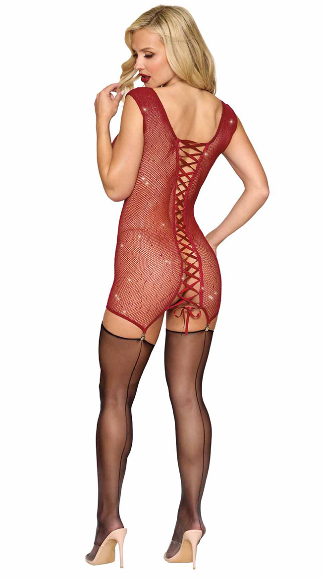• Seamless garter slip with iridescent red rhinestones, keyhole openings on the front with bows accents,