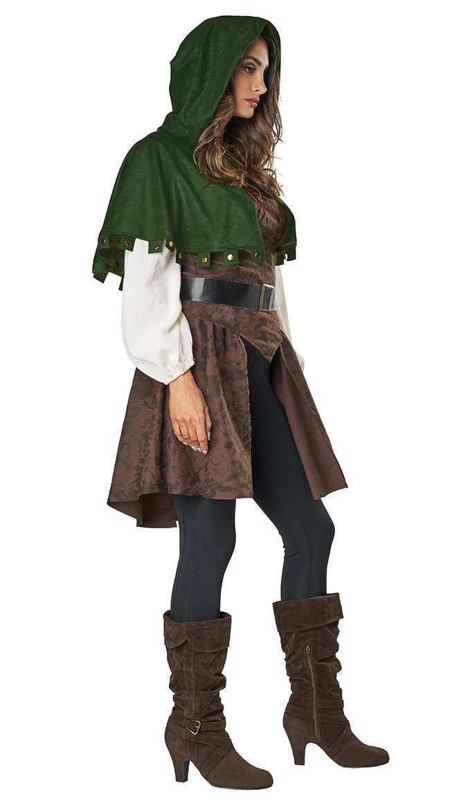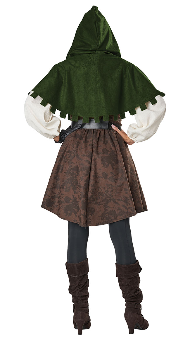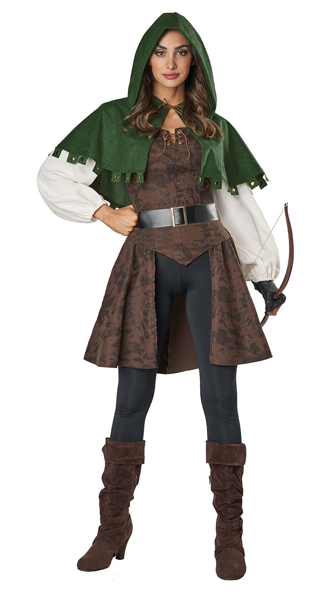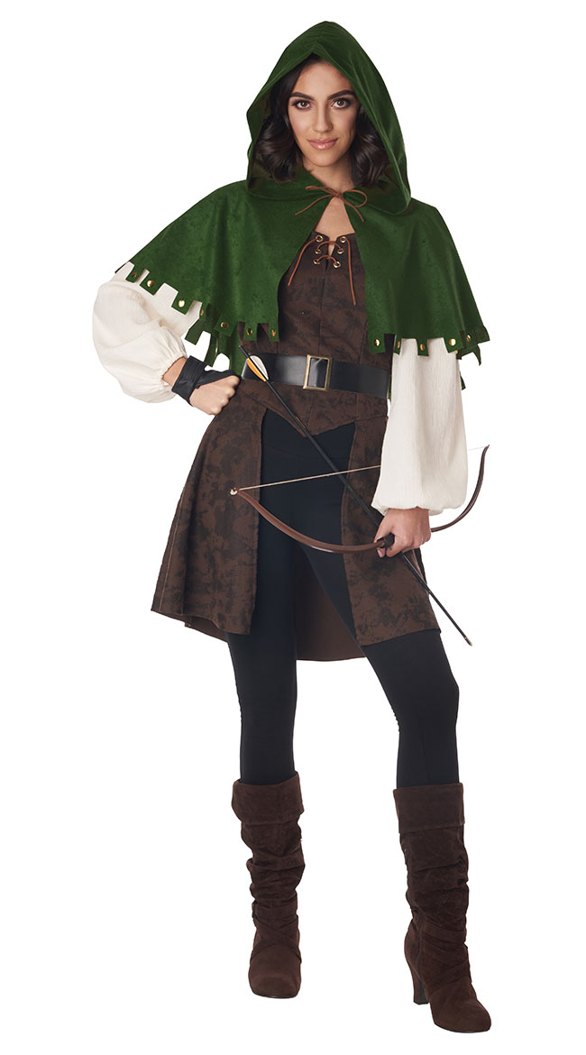 Grab your bow and arrow... it's time to help the poor! The rich will be handing their money over to you in this Robbing Your Hood costume featuring a brown tunic with a lace-up neckline, a green hooded cape with gold metal accents, and archers’ gloves. (Shirt, pants, bow, and boots not included.)