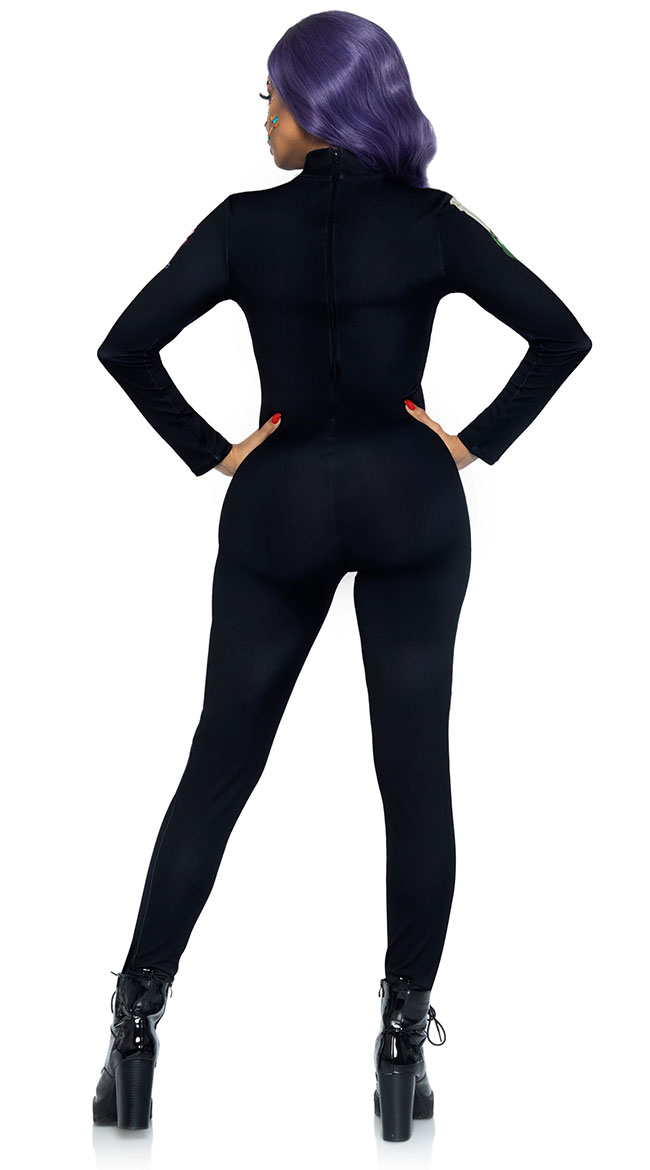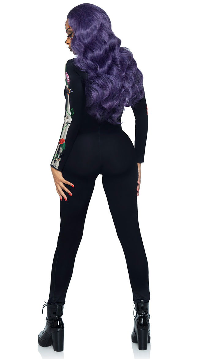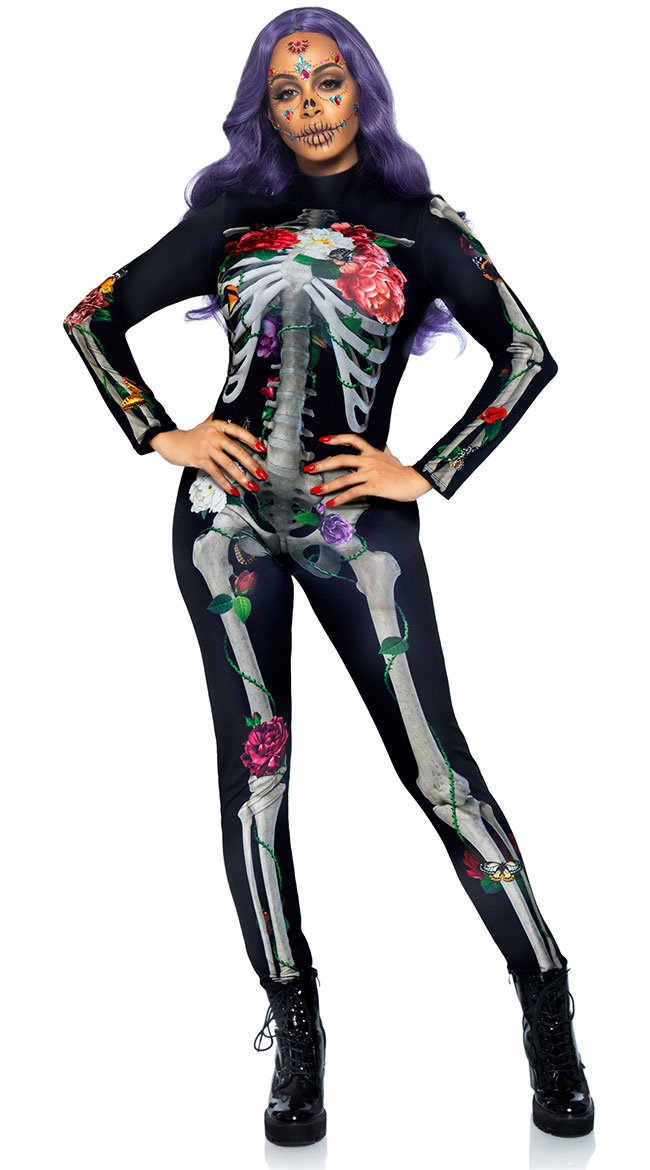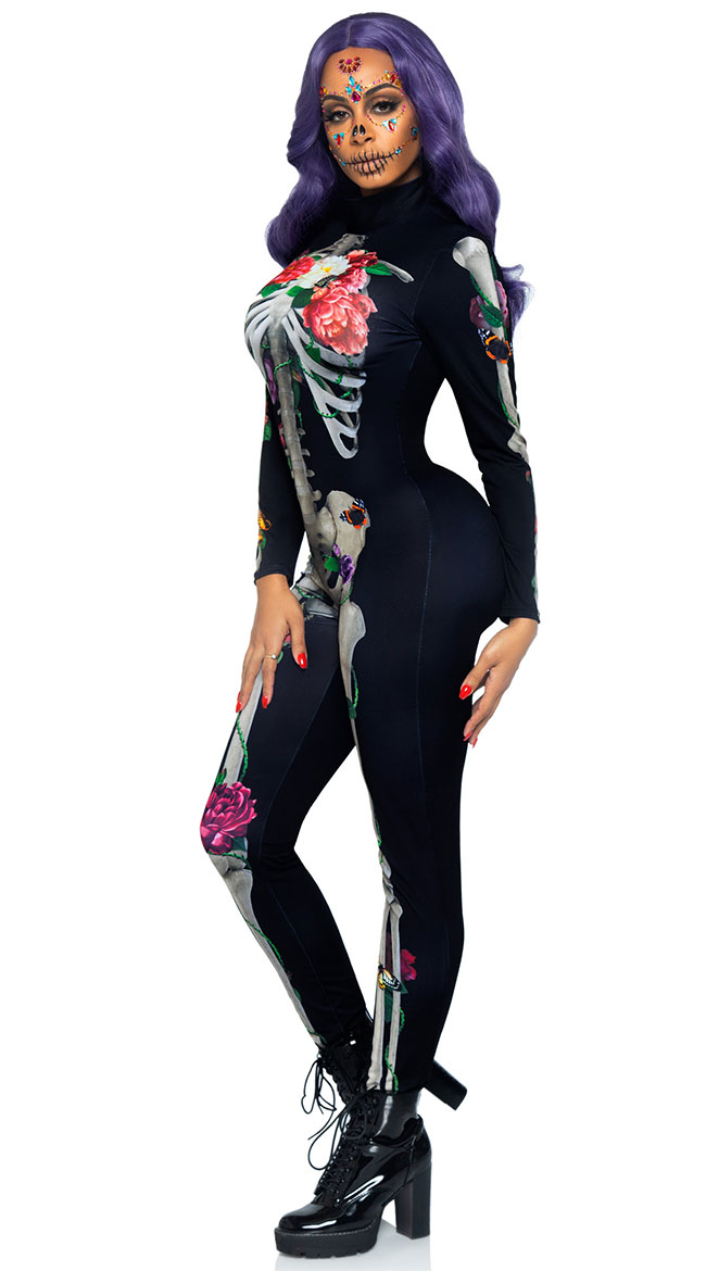 You'll look too good to hide in anyone's closet in this Rose From The Dead costume featuring a black skeleton catsuit with floral details, long sleeves, a back zip closure, and an ankle length. (Wig, face stickers, and boots not included.)