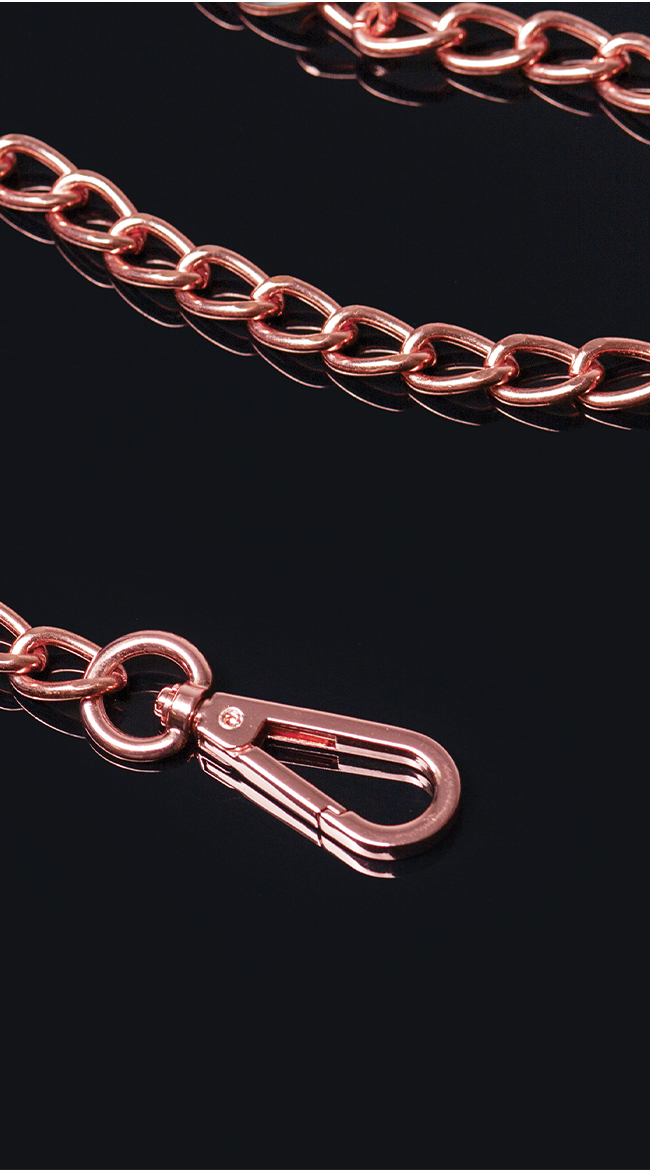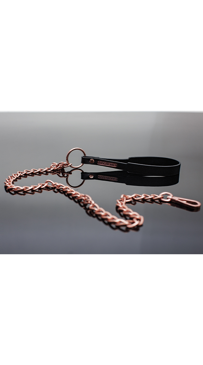 Give in to your every desire with this provocative leash featuring a black handle with rose gold plating, a removeable O-ring accent, and a rose gold chain with an attached clip. (Leash only.)