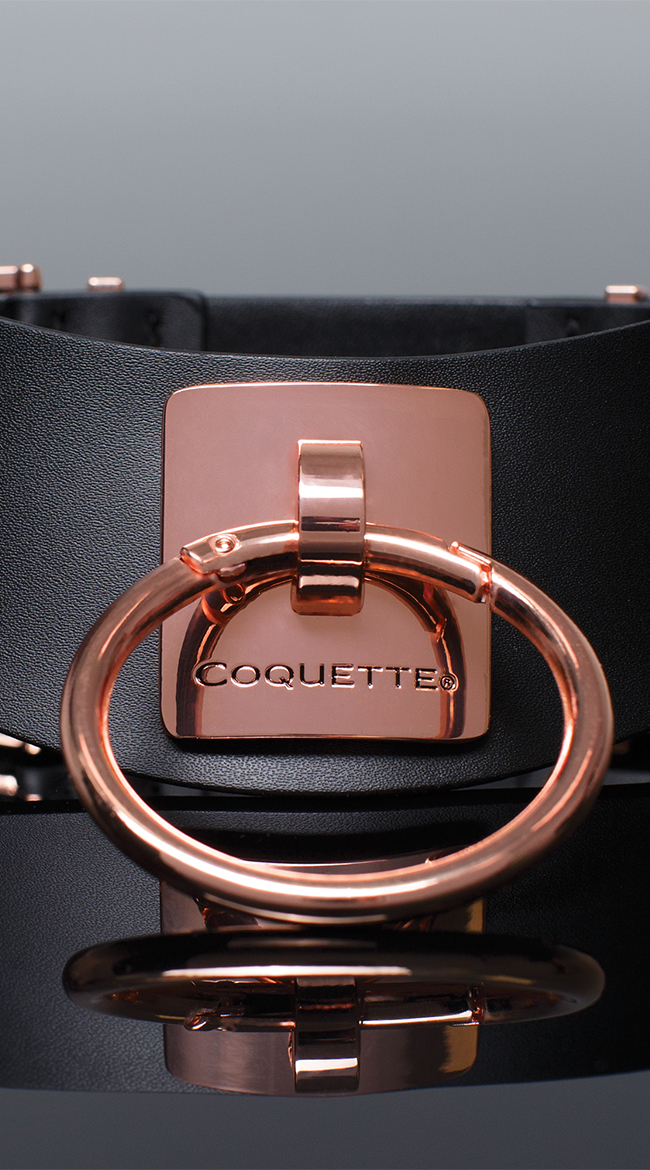 Slip into a submissive state with this black collar featuring a rose gold front plate, a removeable O-ring, and double adjustable buckle closures. (Collar only.)