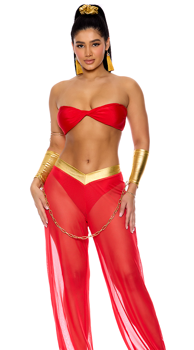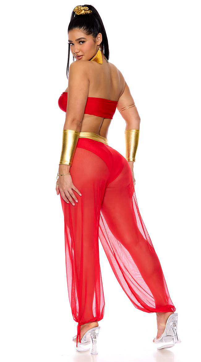 • V-cut help mesh pants paired with gauntlets with chain and scrunchie