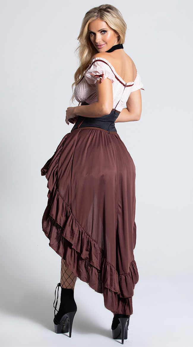 The dress is pink and skirt brown. Not the colors I was expecting at all. The costume I received said saloon gal not saloon girl so I’m unsure if there’s a difference but it had one ruffle not two at the bottom and was pink and brown.