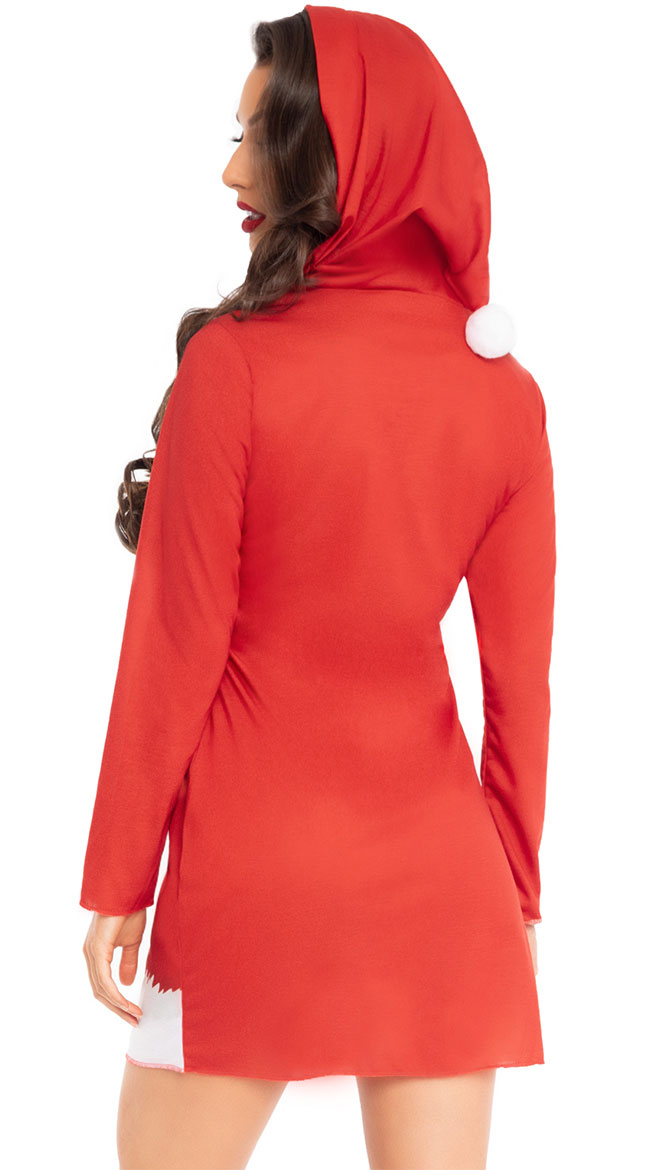 Give Father Christmas a glam touch in this flirty Santa T-Shirt Dress costume featuring a red dress with a V-neckline, long sleeves, a white front panel with printed fur trim detail, a printed sparkle belt waist, a printed faux fur trim hemline, and an oversized hood with a pom-pom accent.