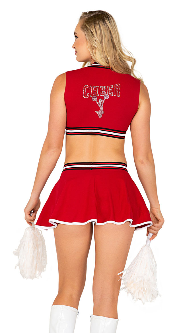 Get ready to tumble! Perform your favorite routine in this School Spirit Cheerleader costume featuring a red crop top with a white and black varsity trim, a bedazzled "CHEER" design with a cheerleader silhouette, a matching mini skirt, and a pair of white pom-poms. (Boots not included.)