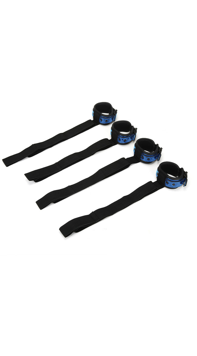 Get in the mood with this sexy bed tie set featuring four adjustable fabric cuffs for spreading wrists and ankles in the most pleasing of positions, and four attached heavy duty straps that wrap around bed posts with ease. There are so many creative ways to play.