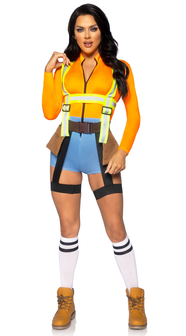 Make your own catcalls in this Sexy Construction Worker costume featuring an orange and blue romper with a front zipper closure, long sleeves, a cheeky cut back, and a reflective harness with adjustable straps, a front buckle closure, brown tool pockets, and black garter straps with wraparound leg garters. (Hammer not included.)