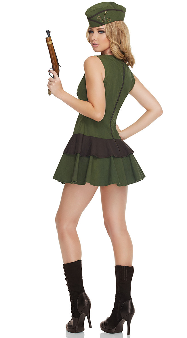 Be in charge while wearing this Sexy Steampunk Soldier costume featuring a green steampunk dress and a hat with gear accents and a key. (Handgun and boots not included.)