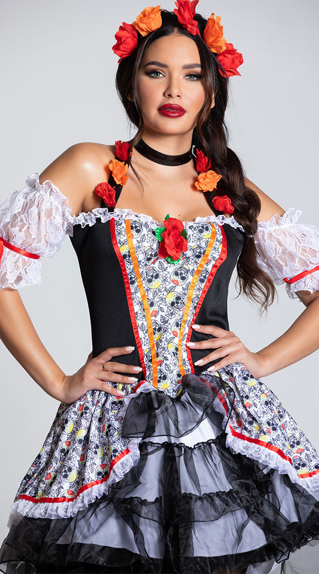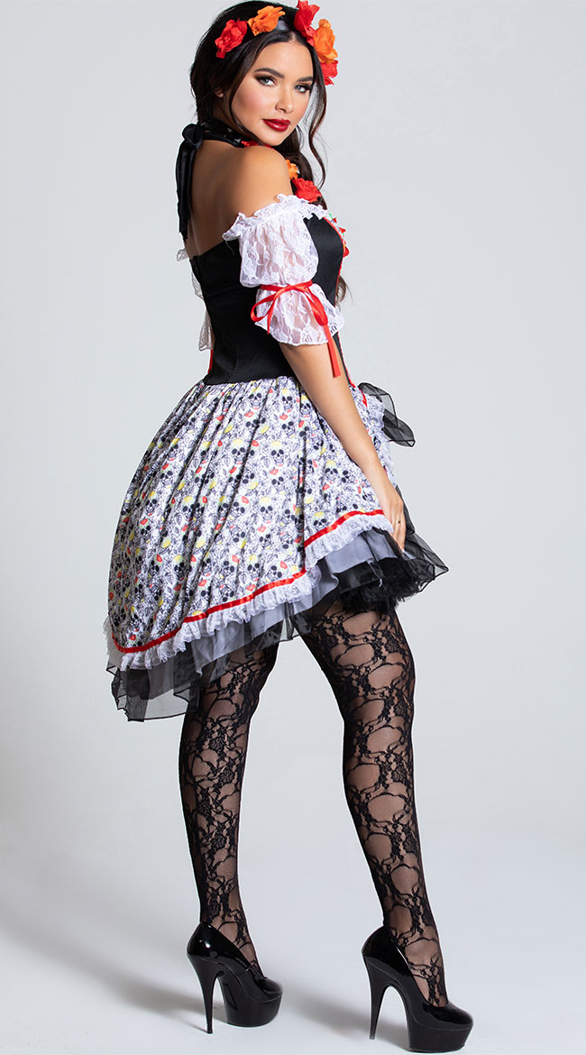 Raise the dead in this Sugar Skull Senorita costume featuring a high-low dress with white lace off the shoulder sleeves, halter straps with bright floral accents, a ruffled sweetheart neckline, a sugar skull design, a black tiered skirt, and a floral headband. (Pantyhose not included.)