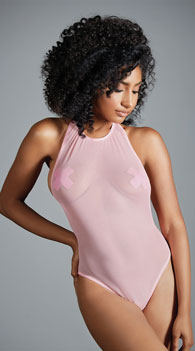 Hug your curves in this flirty mesh teddy featuring a high neckline, a sheer bodice, a low open back, and a cheeky cut back. (Pasties, harness and choker not included.)