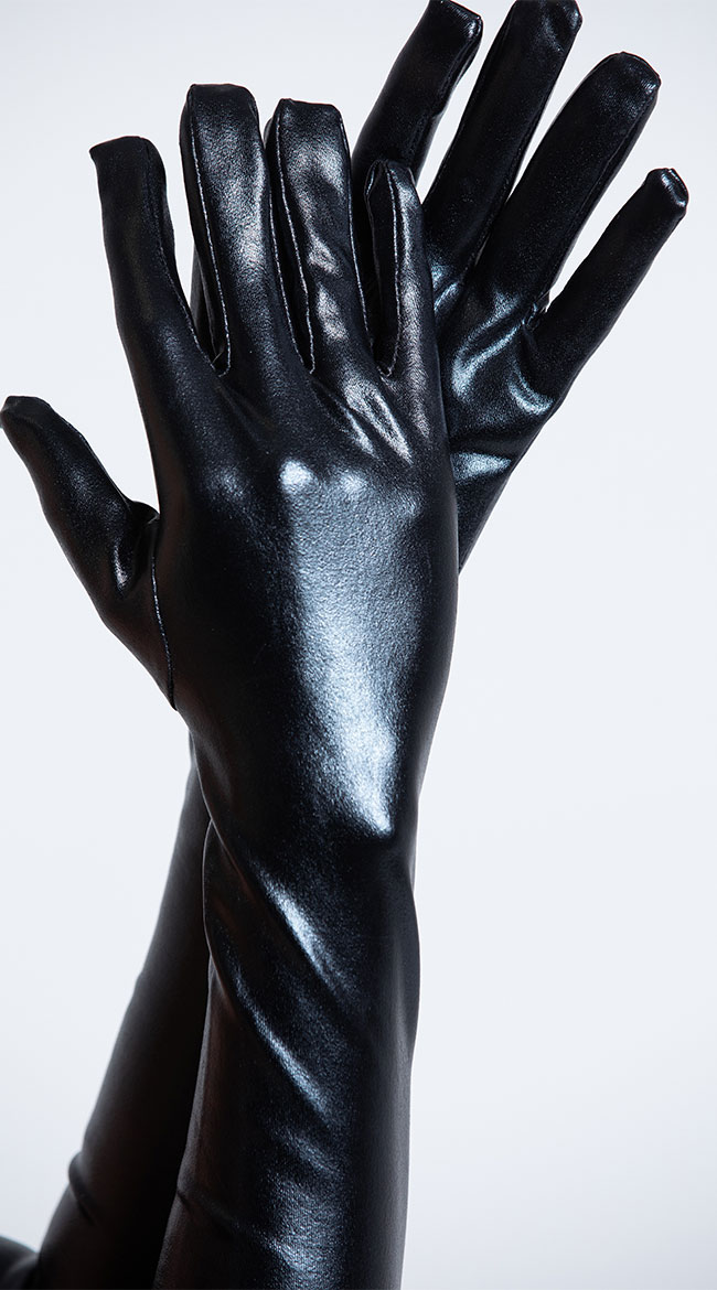 More of a satin finish than super glossy/latex looking, but feels better since they breathe and are stretchy enough to be comfortable to wear for a long time.