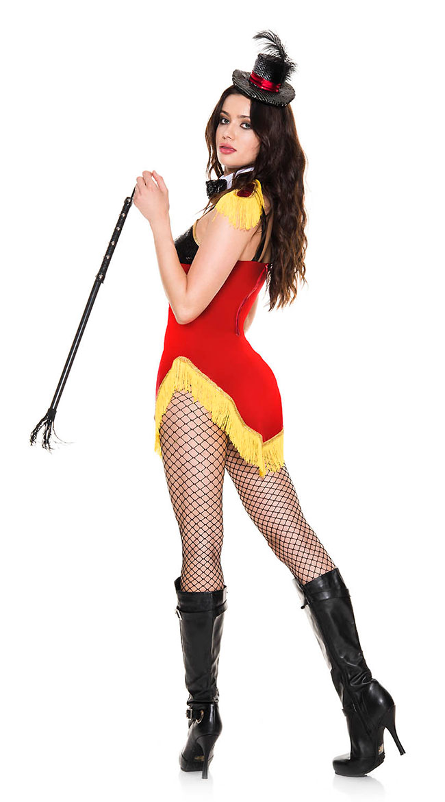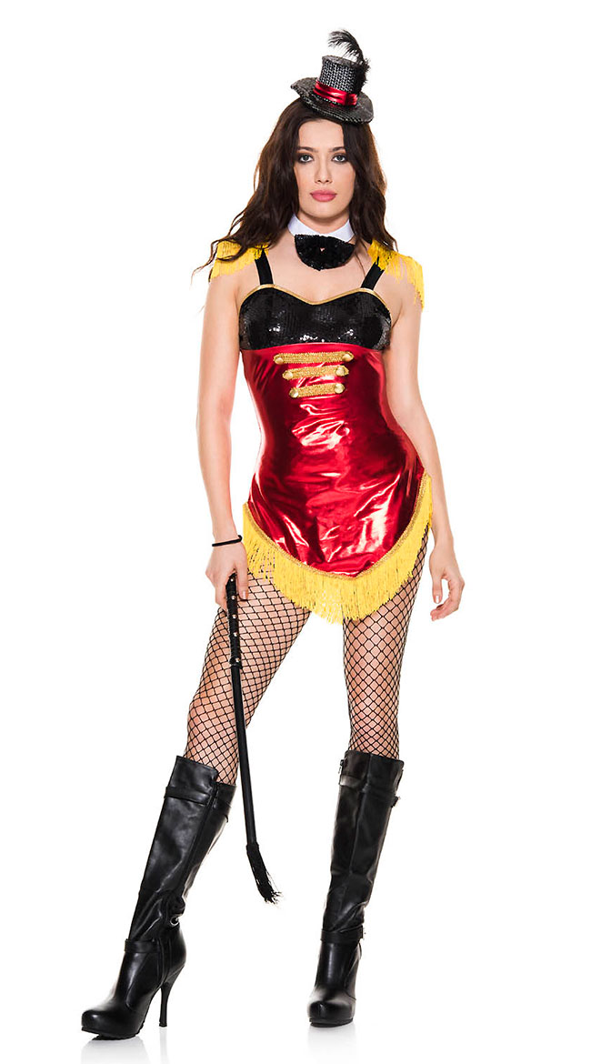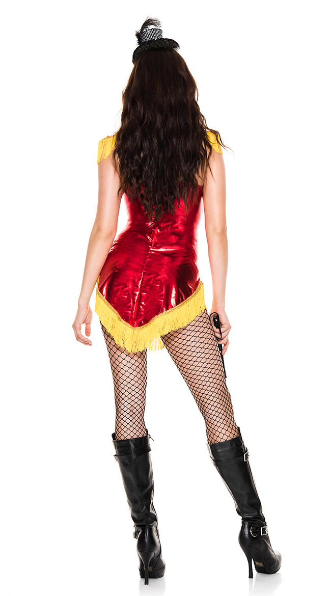 All eyes will be on you in the center ring! Effortlessly run the circus in this Showstopper Ringleader costume featuring a metallic mini dress with a sweetheart neckline, sequin cups, a back zipper closure, gold fringe trim, and button bodice accents, a sequin bow tie collar, and a glitter hat with an attached feather. (Fishnet pantyhose and whip not included.)