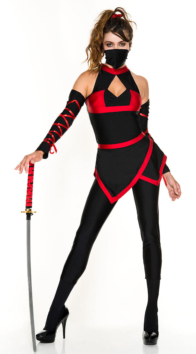 Sharpen your sword for a day of play in this Slay All Day Ninja costume featuring an asymmetrical black and red dress with a high keyhole neckline, red lace-up arm warmers, matching black leggings, a sleek black face mask, and a cute red hair tie. (Sword and shoes not included.)