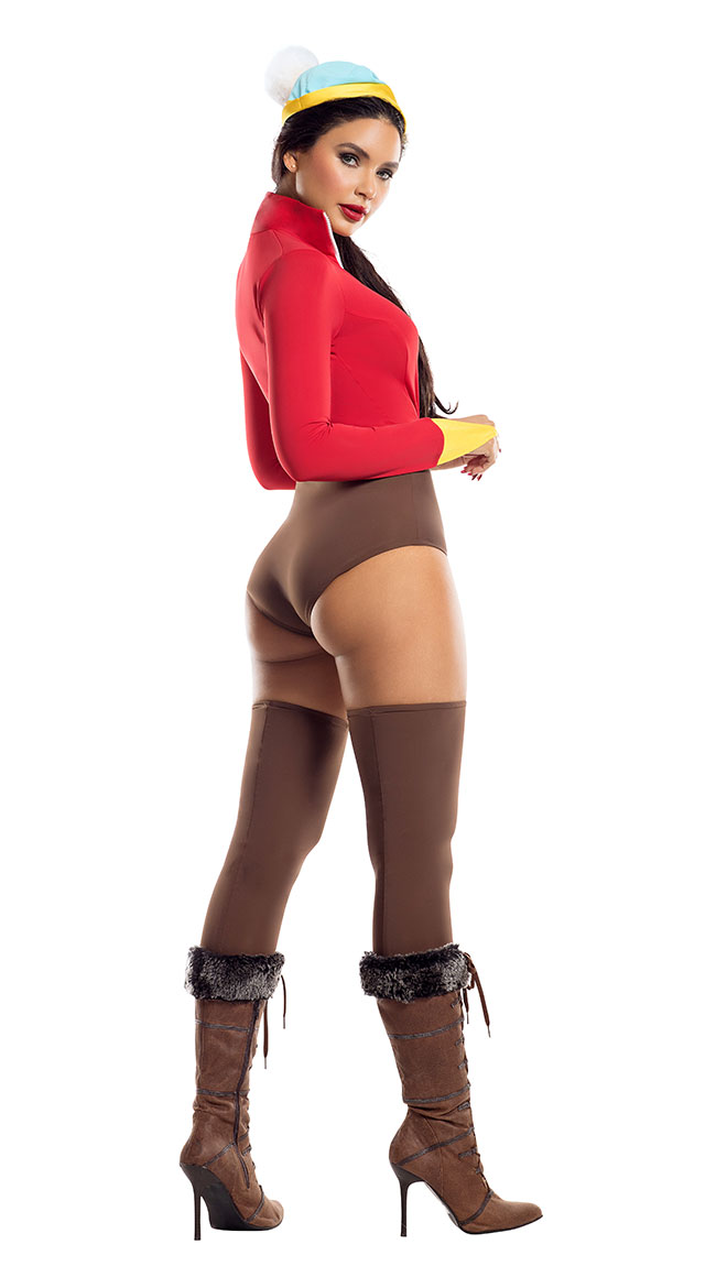 Command everyone to respect your authority in this Small Town Erika C. costume featuring a red and brown romper with a front zipper closure, a high collar, long sleeves with yellow fingerless gloves, a cheeky cut back, attached garters, matching thigh high stockings, and a blue hat with a white pom pom accent and a yellow trim.