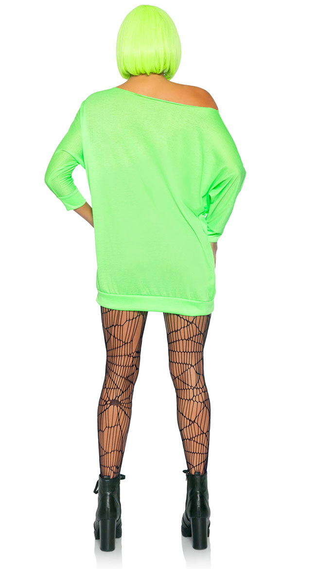 Well, well, well, what have we here? Make them scream in this So Spooky dress costume featuring a bright green mini dress, an off-the-shoulder silhouette, and a skeleton face screen print. (Wig, face stickers, stockings, and boots not included.)