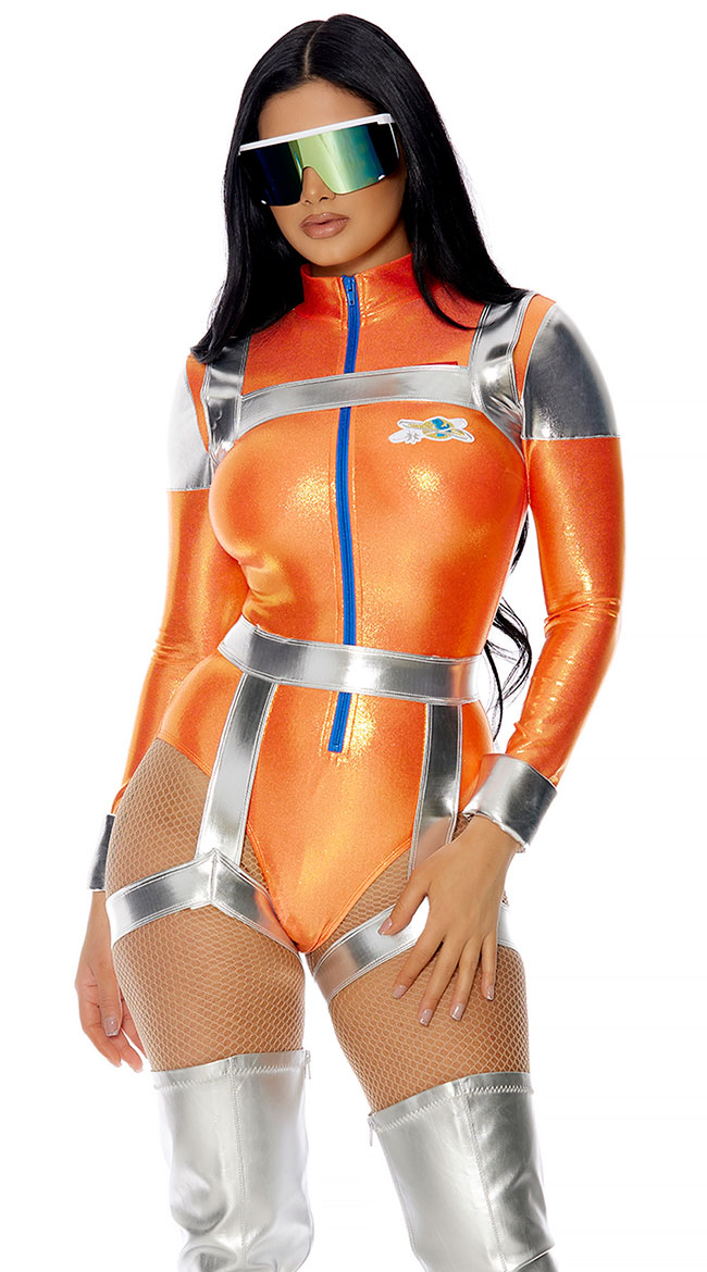 You will look out of this world in this Space Out Astronaut costume featuring an orange metallic bodysuit with a front zipper closure, a high neckline, long fitted sleeves, silver shoulder and cuff accents, space insignias on the chest, high cut sides, a cheeky cut back, a cropped silver harness, a silver garter belt with attached wraparound leg garters, and visor glasses. (Boots not included.)