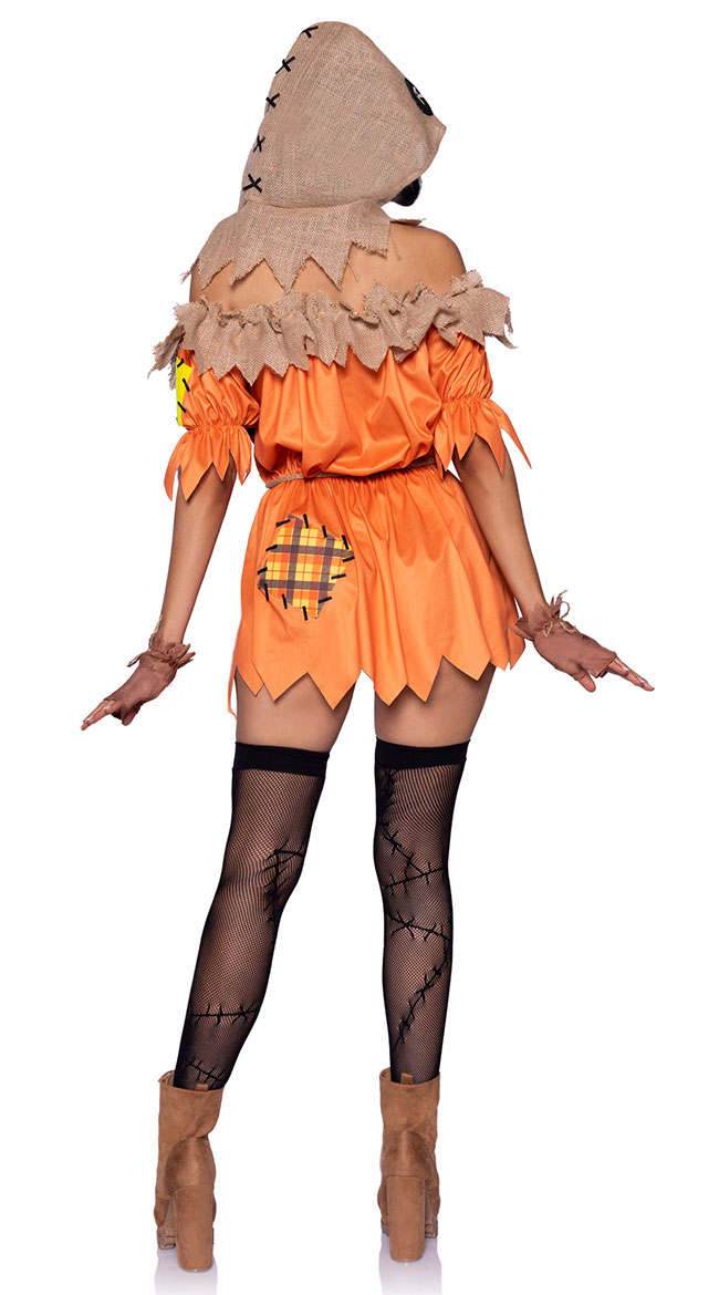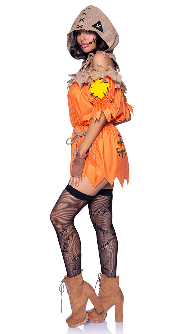 Wreak havoc in this Spooky Scarecrow costume featuring an orange off-the-shoulder dress with a burlap trim, short sleeves with jagged cuffs, a gathered waist with a rope belt, a jagged skirt, allover patchwork details, a burlap hook with black stitch and eye patch detailing, a tie closure, and matching fingerless gloves. (Thigh high stockings not included.)