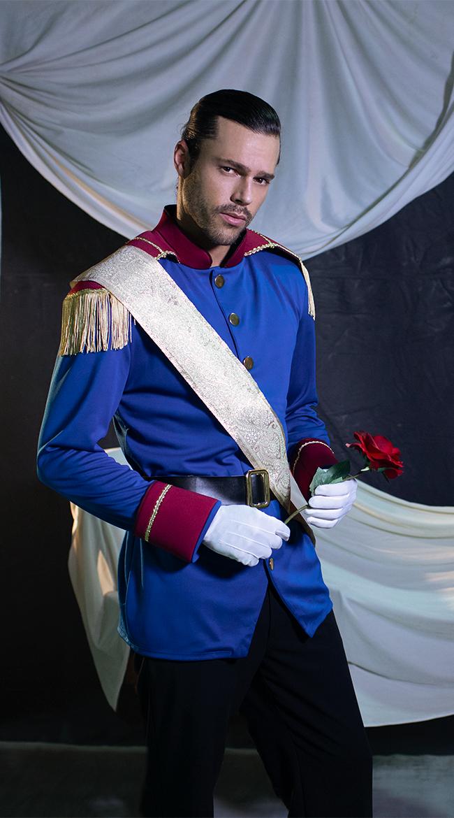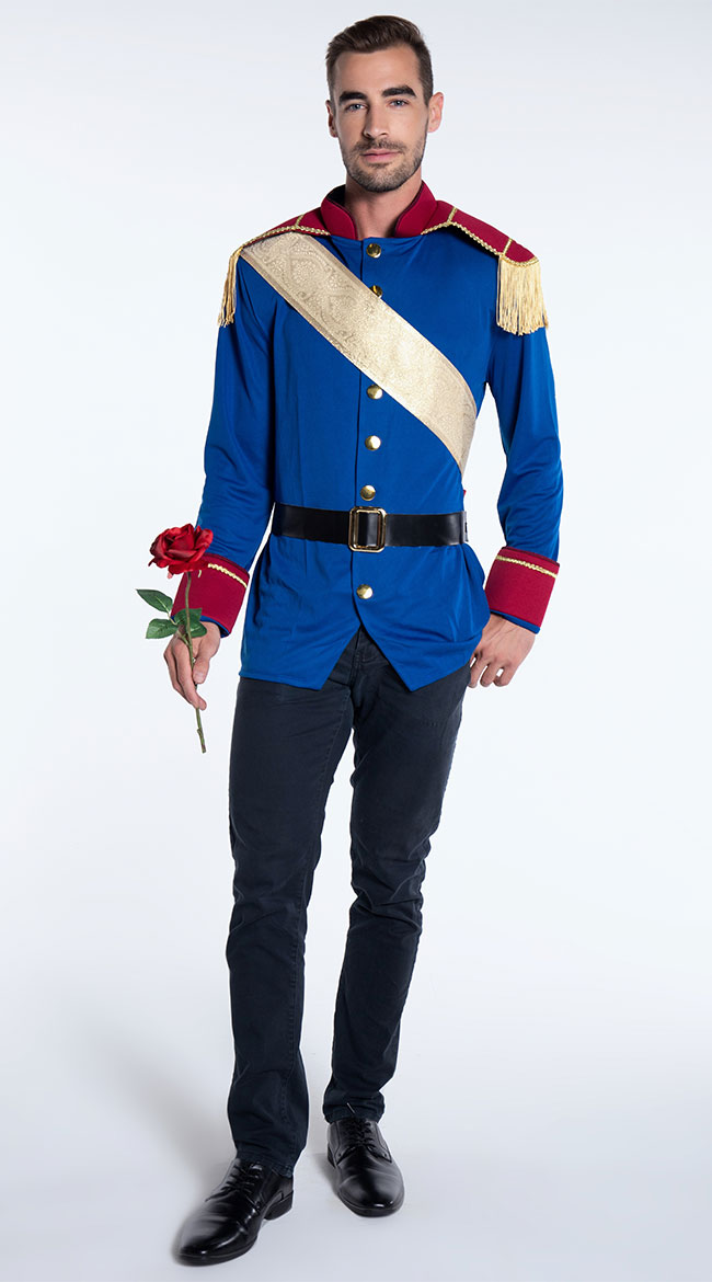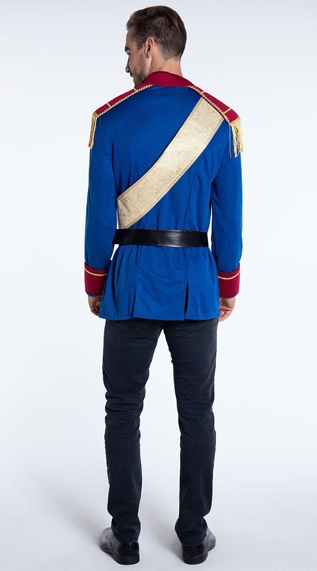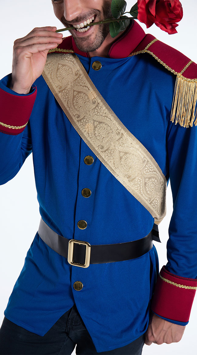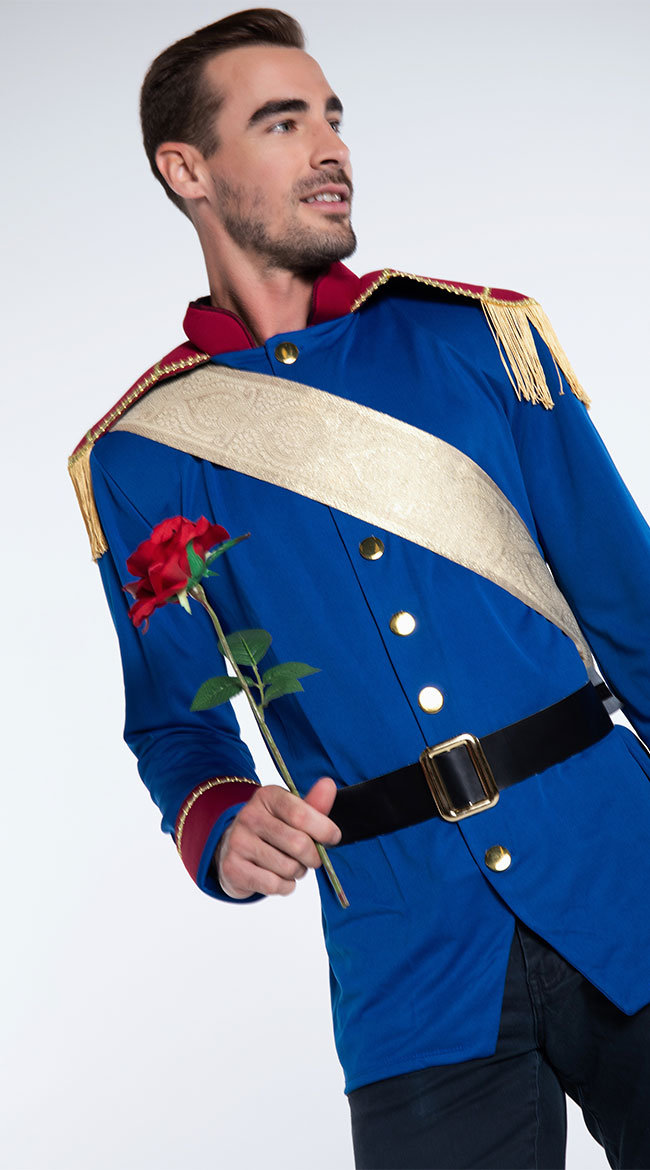 Search for your true love in this Storybook Prince costume featuring a blue jacket with red epaulets, gold fringe, gold sash and black belt. (Gloves, pants, and flower not included.)
