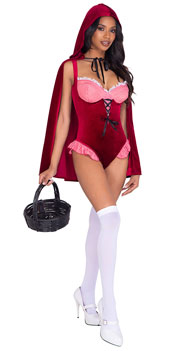 What a vision! You'll be a woodsy wonder as you strut your stuff to grandma's house in this Storybook Red costume featuring a velvet romper with gingham print padded cups, a ruffled trim, a lace-up detail, and a hooded cape with tie closure. (Basket, stockings, and shoes not included.)