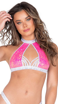 Flash your style in this fun dancewear top featuring a high keyhole neckline with halter straps, sequin cups, a strappy bust detail, and a hook back closure.