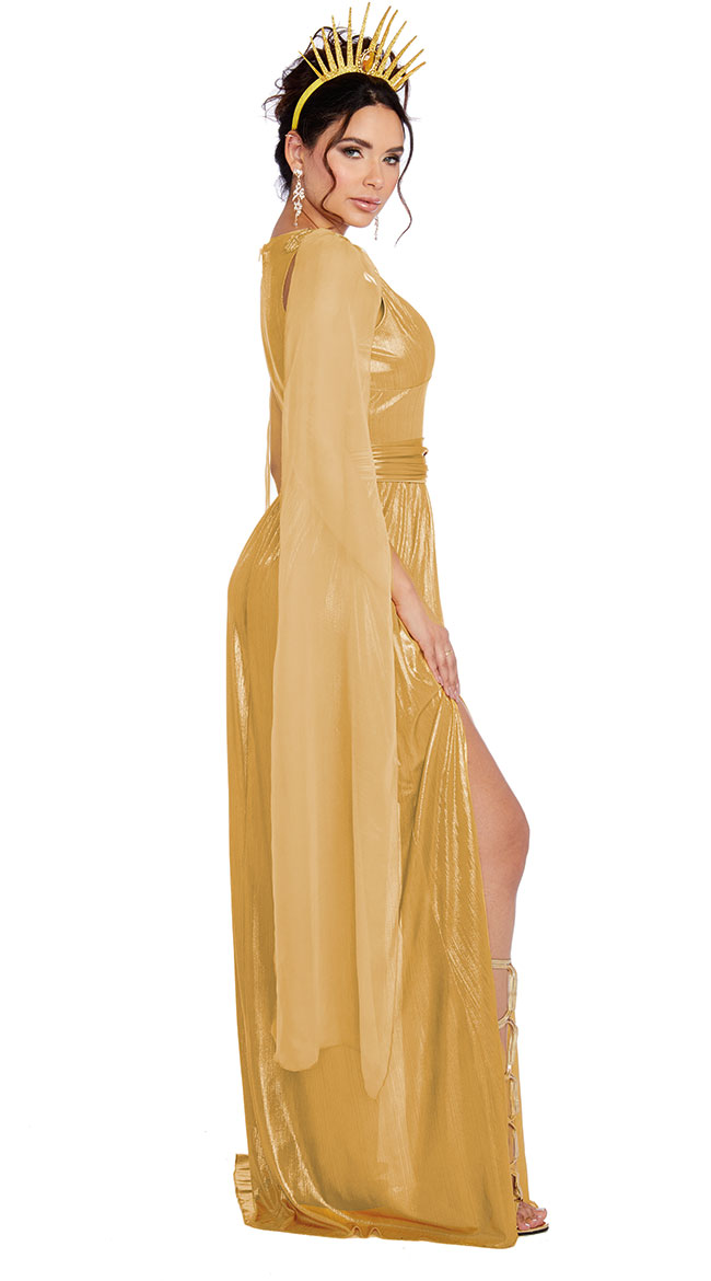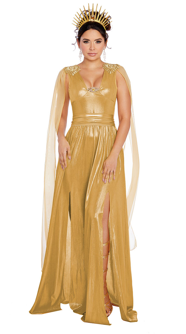 Is it bright in here, or is it just your striking luminescence? Blind them with your beauty in this Sun Goddess costume featuring a shimmering gold gown with shoulder appliques, draping long mesh sleeves, a gorgeous jeweled broach, a billowy skirt with front slits, and a gold crown headpiece with jewel accent. (Shoes not included.)