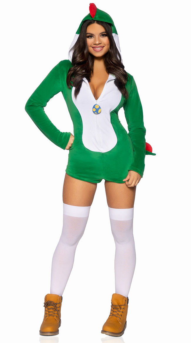 Level up to the ultimate best friend in this Super Dino costume featuring a green velvet romper with a white bodice panel, a front zipper closure with a dinosaur egg accent, long sleeves, an attached hood, a red scalloped spine, an attached tail, a white back panel, and a cheeky cut back. (Thigh high stockings not included.)