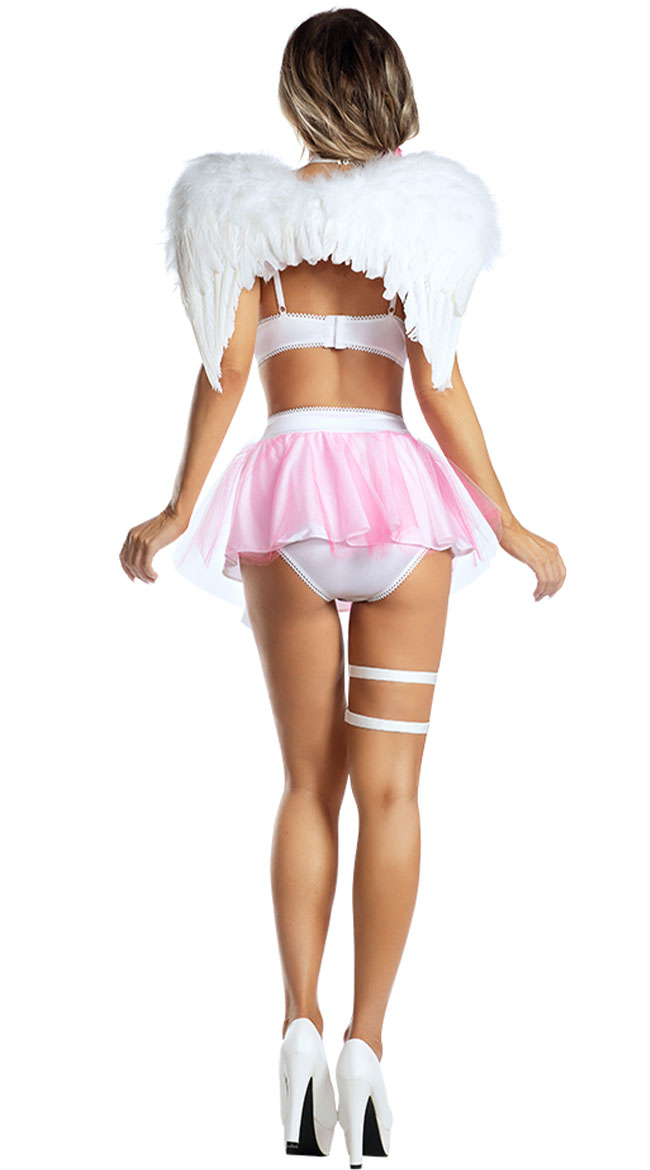 Grab your bow and arrow...you have work to do! Bring on the romance in this Sweet Cupid costume featuring a white bra top with sequin heart accents and a harness neckline, a matching skirted panty with an attached wraparound leg garter, and a magical heart wand. (Shoes and wings not included.)