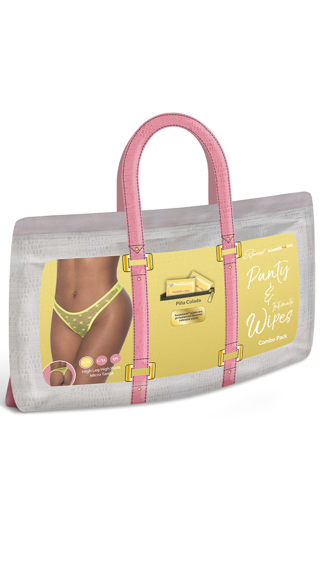 A high-waisted cheeky panty featuring star details and a high leg style. Paired with 2 packets of Pina Colada flavored Sweetums pH-balanced intimate wipes. Bursting with the delicious taste of juicy pineapple and smooth coconut, these wipes are as refreshing as a beachside cocktail — no passport required.Comes in a reusable pink-handle pouch perfect for gifting or packing intimates for your next tripEach wipe is pH-balanced, water-based, and wrapped individually for freshness on-the-go. Whether you're freshening up after a long day or turning up the heat, this tropical treat is your new go-to for feeling clean, confident, and delicious.Take your intimate care routine somewhere sunny.- pH balanced- Vegan- Made in the USA- No added parabens - No added dyes - Cruelty free - Water-based & non-stickyIngredients - Water, Glycerin, Stevia Rebaudiana Extract, Xanthan Gum, Citric Acid, Sodium Benzoate, Potassium Sorbate, FlavorHow to use - Remove the wipe from the package. Wipe intimate areas. The wipe leaves behind scent and flavor. Discard the wipe after one use.