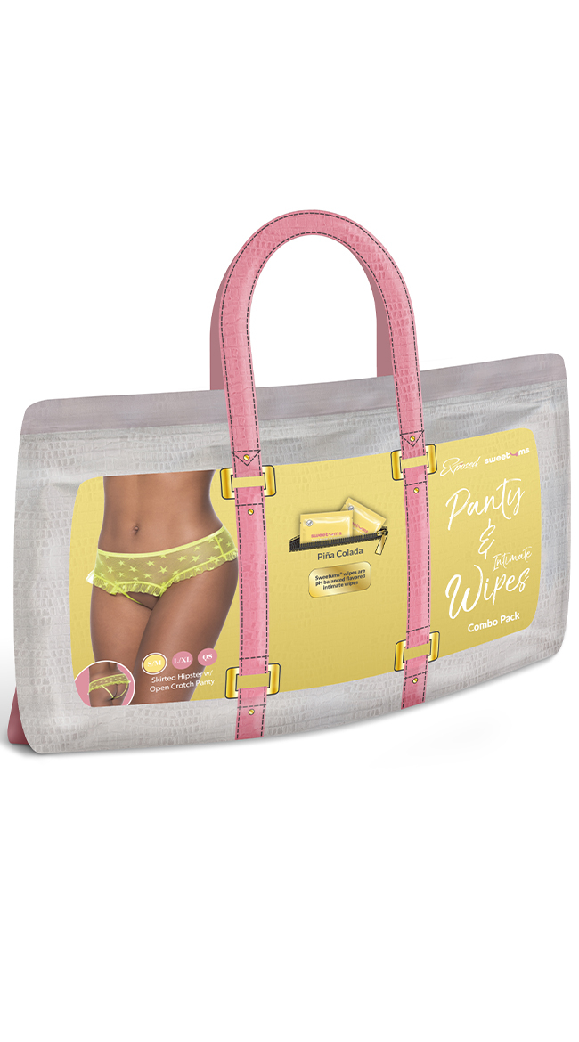 A mesh hipster with star designs and ruffles, and an open crotch. Paired with 2 packets of Pina Colada flavored Sweetums pH balanced intimate wipes. Bursting with the delicious taste of juicy pineapple and smooth coconut, these wipes are as refreshing as a beachside cocktail — no passport required.Comes in a reusable pink-handle pouch perfect for gifting or packing intimates for your next tripEach wipe is pH-balanced, water-based, and wrapped individually for freshness on-the-go. Whether you're freshening up after a long day or turning up the heat, this tropical treat is your new go-to for feeling clean, confident, and delicious.Take your intimate care routine somewhere sunny.- pH balanced- Vegan- Made in the USA- No added parabens - No added dyes - Cruelty free - Water-based & non-stickyIngredients - Water, Glycerin, Stevia Rebaudiana Extract, Xanthan Gum, Citric Acid, Sodium Benzoate, Potassium Sorbate, FlavorHow to use - Remove the wipe from the package. Wipe intimate areas. The wipe leaves behind scent and flavor. Discard the wipe after one use.
