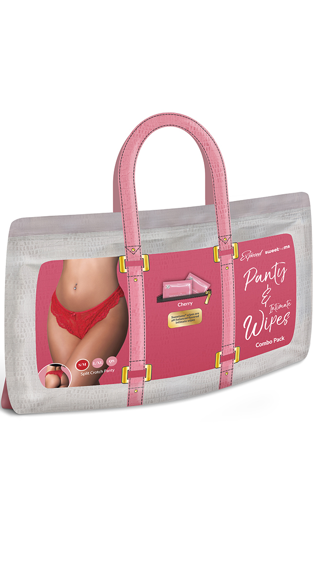 Open Crotch Panty, is the perfect balance of elegance and seduction. This luxurious wholesale lace panty features delicate floral galloon lace, scalloped edges, and a satin bow for a playful touch. The daring opencrotch design adds a bold element, while the soft, stretchy mesh in a fiery red hue enhances comfort and allure. Comes in a reusable pink-handle pouch perfect for gifting or packing intimates for your next tripPaired with two packets of Cherry-flavored Sweetums pH-balanced intimate wipes. this wholesale red boy short offers the perfect combination of comfort, style, and freshness. made to delight your senses and spark connection. With a juicy, candy-like scent and taste, these wipes are sweet, bold, and totally unforgettable.Fun fact: research shows that the scent of cherry can evoke feelings of happiness, playfulness, and even arousal. It’s no wonder this flavor is a fan favorite — it lifts your mood and sets the tone for flirty, feel-good moments.If you're someone who loves to feel sweet, sassy, and ready for anything, Cherry is calling your name.Each wipe is pH-balanced and carefully formulated with your body’s chemistry in mind. Whether you're at home or on the go, these individually wrapped wipes are designed for discreet convenience and undeniable pleasure.- pH balanced- Vegan- Made in the USA- No added parabens - No added dyes - Cruelty free - Water-based & non-stickyIngredients - Water, Glycerin, Stevia Rebaudiana Extract, Xanthan Gum, Citric Acid, Sodium Benzoate, Potassium Sorbate, FlavorHow to use - Remove the wipe from the package. Wipe intimate areas. The wipe leaves behind scent and flavor. Discard the wipe after one use.